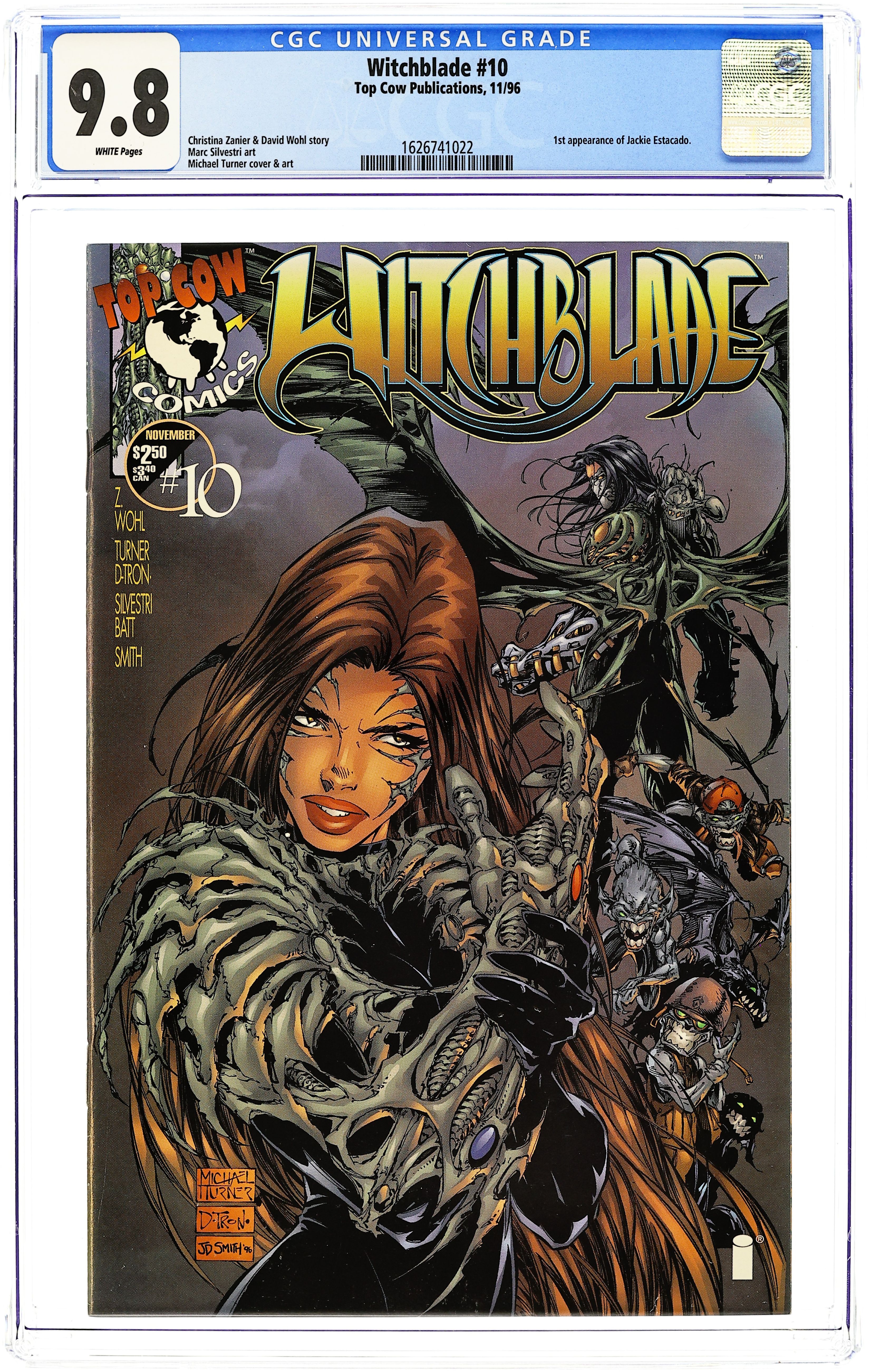 Direct Edition. Standard Cover by Michal Turner and D-Tron. 1st appearance of The Darkness. Cover pencils by Michael Turner, inks by D-Tron. Witchblade & The Darkness, script by Marc Silvestri (Co-Plot), Christina Z, and David Wohl, pencils by Michael Turner (pgs. 1-6, 11-22) and Marc Silvestri (pgs. 7-10), inks by D-Tron (pgs. 1-6, 11-22), Matt Banning (pgs. 7-10), Jose Guillen (Assistant), Viet Truong (Assistant), and Jeff Crumpler (Assistant); Mob enforcer Jackie Estacado enters Sara's life and when she tries to bring him down, the Witchblade doesn't want to cooperate. The Witchblade & The Darkness Pin-Up, pencils by Billy Tan Mung Khoy, inks by D-Tron. 36 pgs. $2.50. Cover price $2.50.