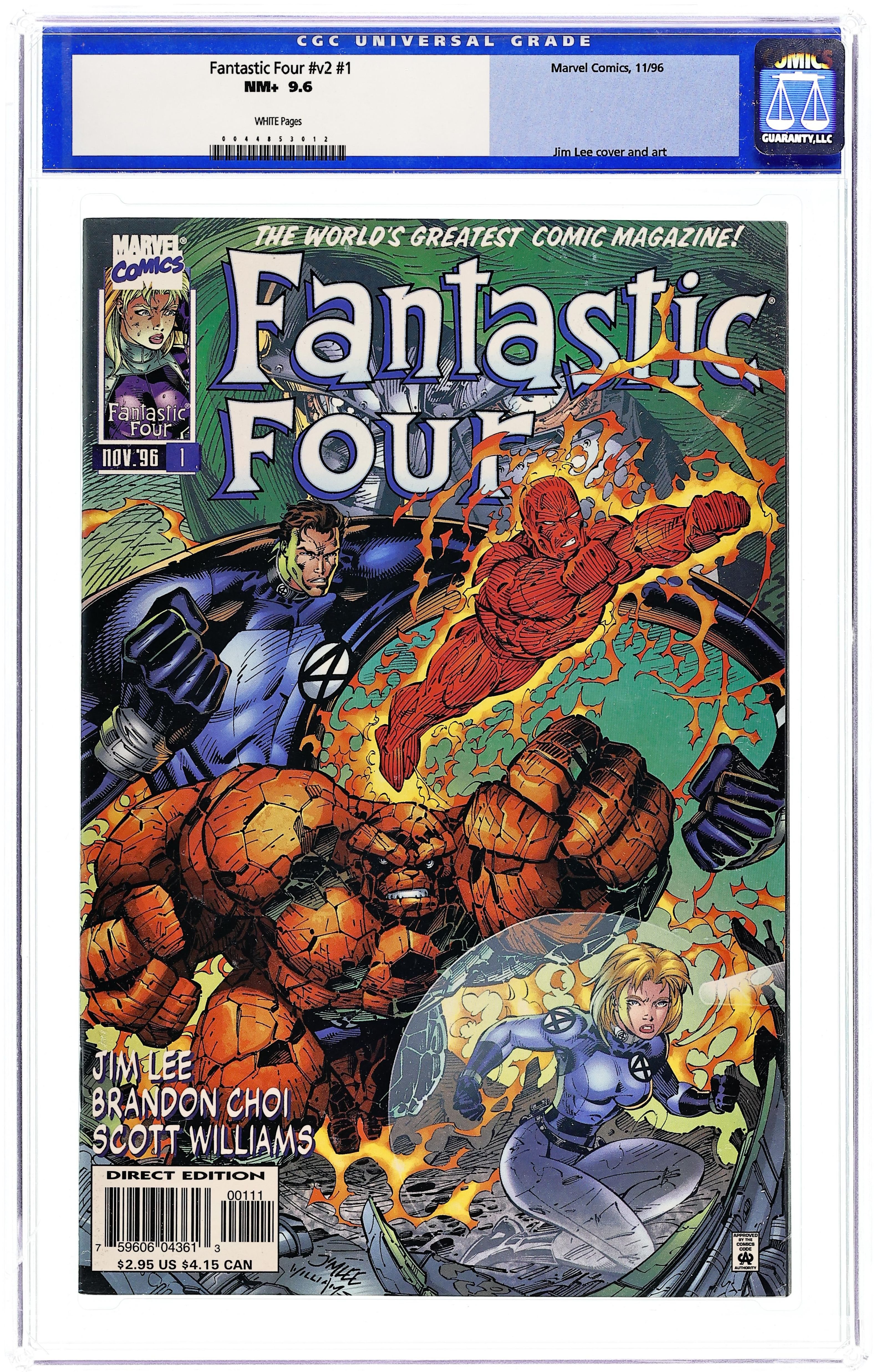 Heroes Reborn. "Renaissance!" Story by Jim Lee and Brandon Choi. Art by Jim Lee and Scott Williams. Witness the rebirth of the World's Greatest Comic Magazine! The greatest heroes of the Marvel Universe (The Avengers and the Fantastic Four) perished in battle with the mutant menace known as Onslaught. However, their story goes on. Told in the tradition of Stan Lee and Jack Kirby by a modern day comic's legend. Jim Lee (X-Men and WildC.A.T.s) re-imagines Marvel's first family for the new millennium. While on an experimental space flight, Doctor Reed Richards, pilot Ben Grimm, benefactor Susan Storm, and her brother Johnny Storm are bombarded by strange cosmic rays that endow them with amazing powers and abilities. Together they become the force for good known as the Fantastic Four. Includes a 6 pages feature called Time Slip. Learn what Iron Man, Doctor Doom, and Nick Fury would be like if Stan Lee created them today. 56 pages. Cover price $2.95.