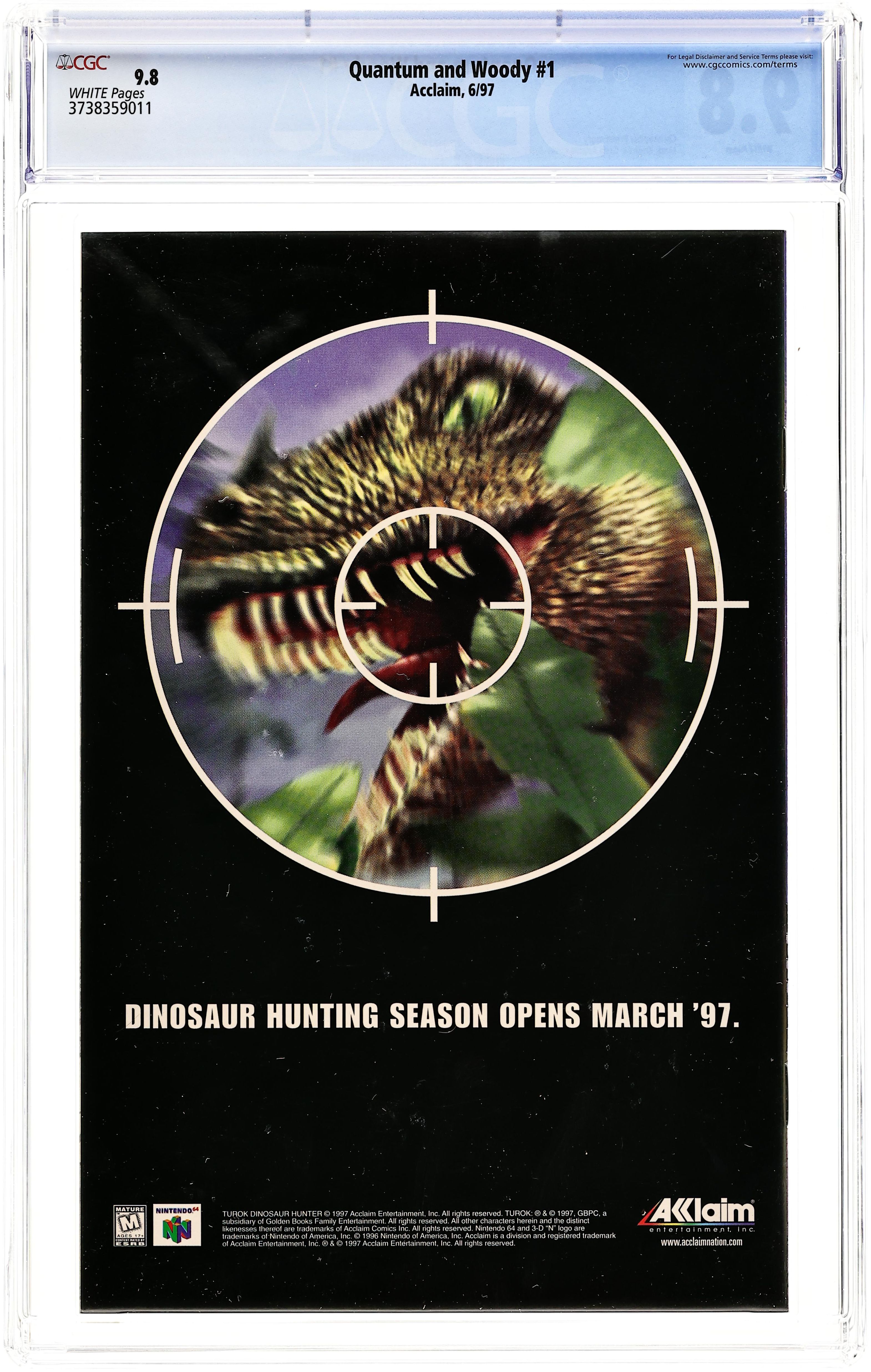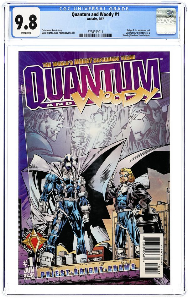 Drawn cover. Acclaim logo bottom left. "Klang" - This, folks, is the world's worst superhero team up! Woodrow Van Chelton and Eric Henderson were once close childhood friends. They haven't seen or spoken to each other in more than fifteen years, with their lives going in drastically different directions. A tragedy reunites them and sets them on the path of finding their fathers' killer. In the process they become inextricably linked, sharing an incredible power, and giving birth to the spandex 'Odd Couple,' Quantum and Woody! Armed with amazing super high-tech gadgets, a Beretta, and a Zippo lighter, can two people who are exact opposites survive being stuck together forever? Script by Christopher Priest, with art by Mark Bright and Greg Adams. FC, 32 pgs. Cover by Mark Bright and Greg Adams. Cover price $2.50.