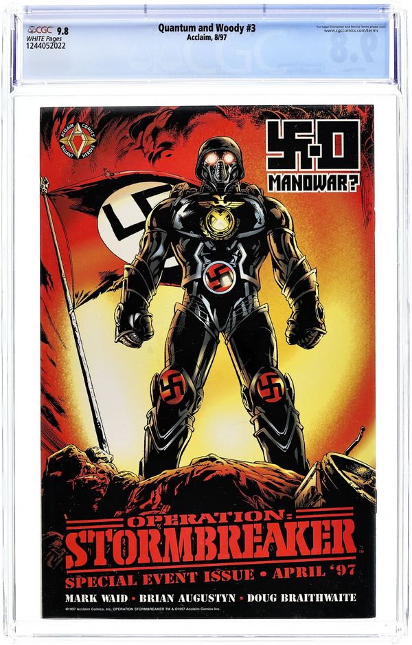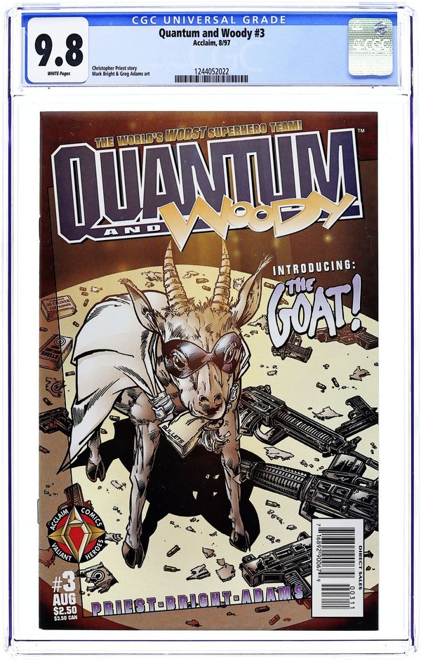 "Yet Another Story" - It's the Dysfunctional Duo's first case -- a murder mystery that sets them on the trail of lots of sweaty guys with big guns. Quantum & Woody unravel a world-threatening international conspiracy and rack up frequent flyer miles as they crisscross the globe on the strength of a single incredibly flimsy clue! All this, and Woody buys a goat. Script by Christopher Priest, with art and cover by Mark Bright and Greg Adams. FC, 32 pgs. Cover price $2.50.