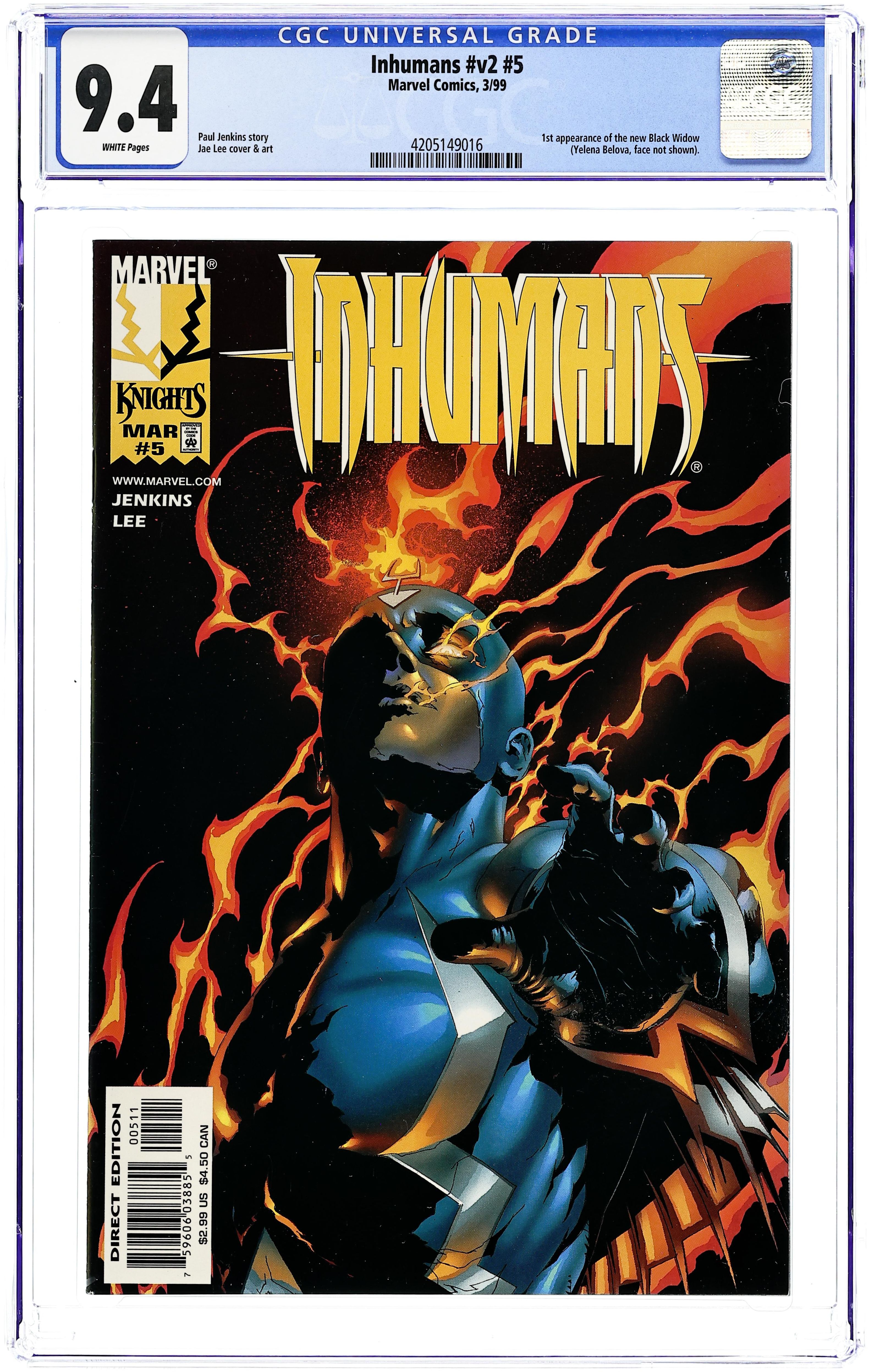 First Contact - Written by Paul Jenkins. Art and Cover by Jae Lee. Earth vs. Attilan -- war! The first salvo has been fired in the assault on the fabled Attilan, whose inhabitants must now decide between diplomacy and retaliation. And while Black Bolt and his closest confidantes weigh their options, the wheels of deception turn in the outside world, as Stalyenko turns to an unlikely source for aid in his campaign against the aliens that live at humanity's door. For all their power, can the Inhumans handle the lies, greed and politics of mankind? Plus: a special guest appearance by the Black Widow, who will soon be starring in her own Marvel Knights limited series! 32 pages, full color. Cover price $2.99.