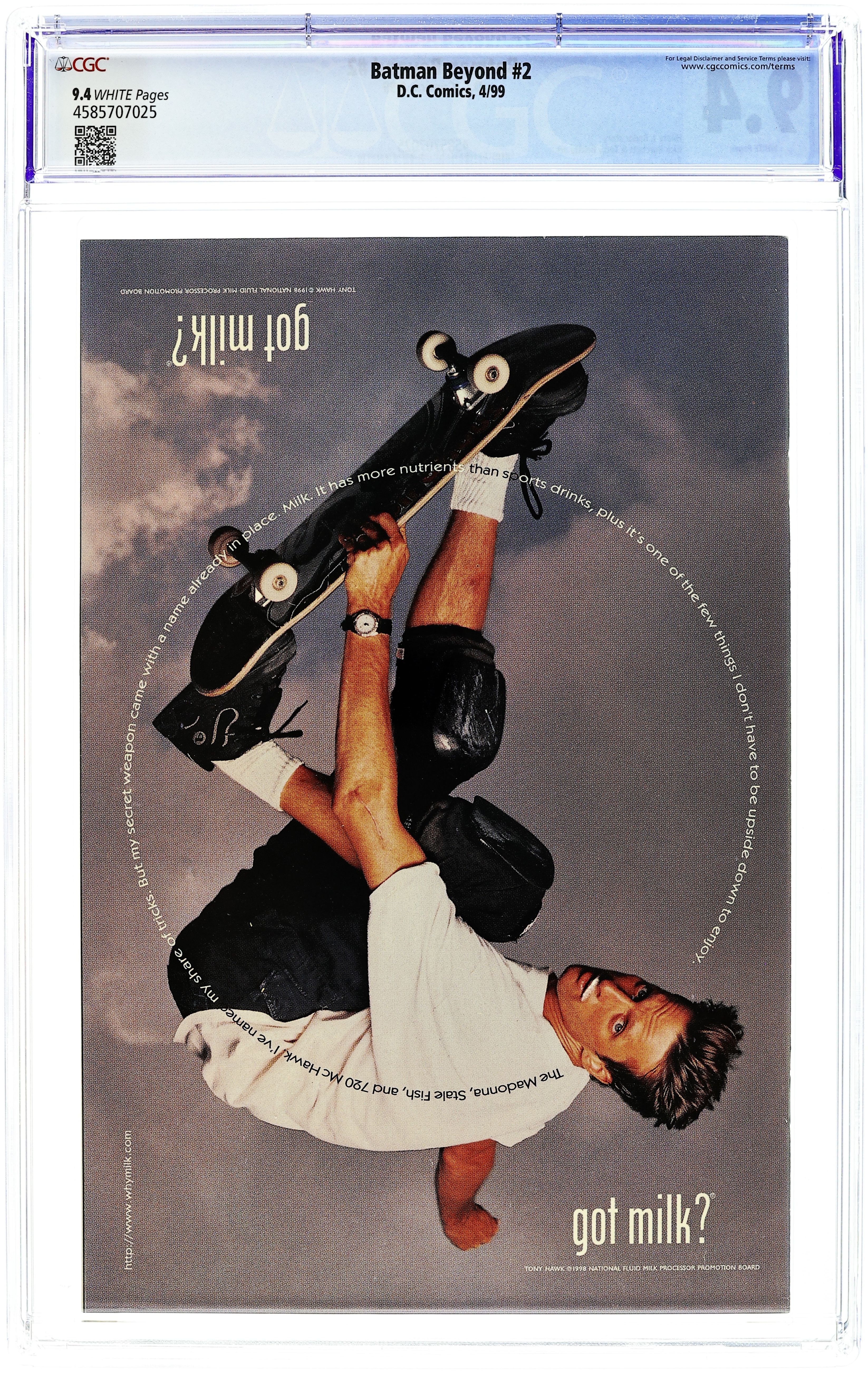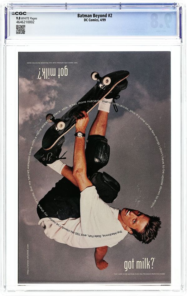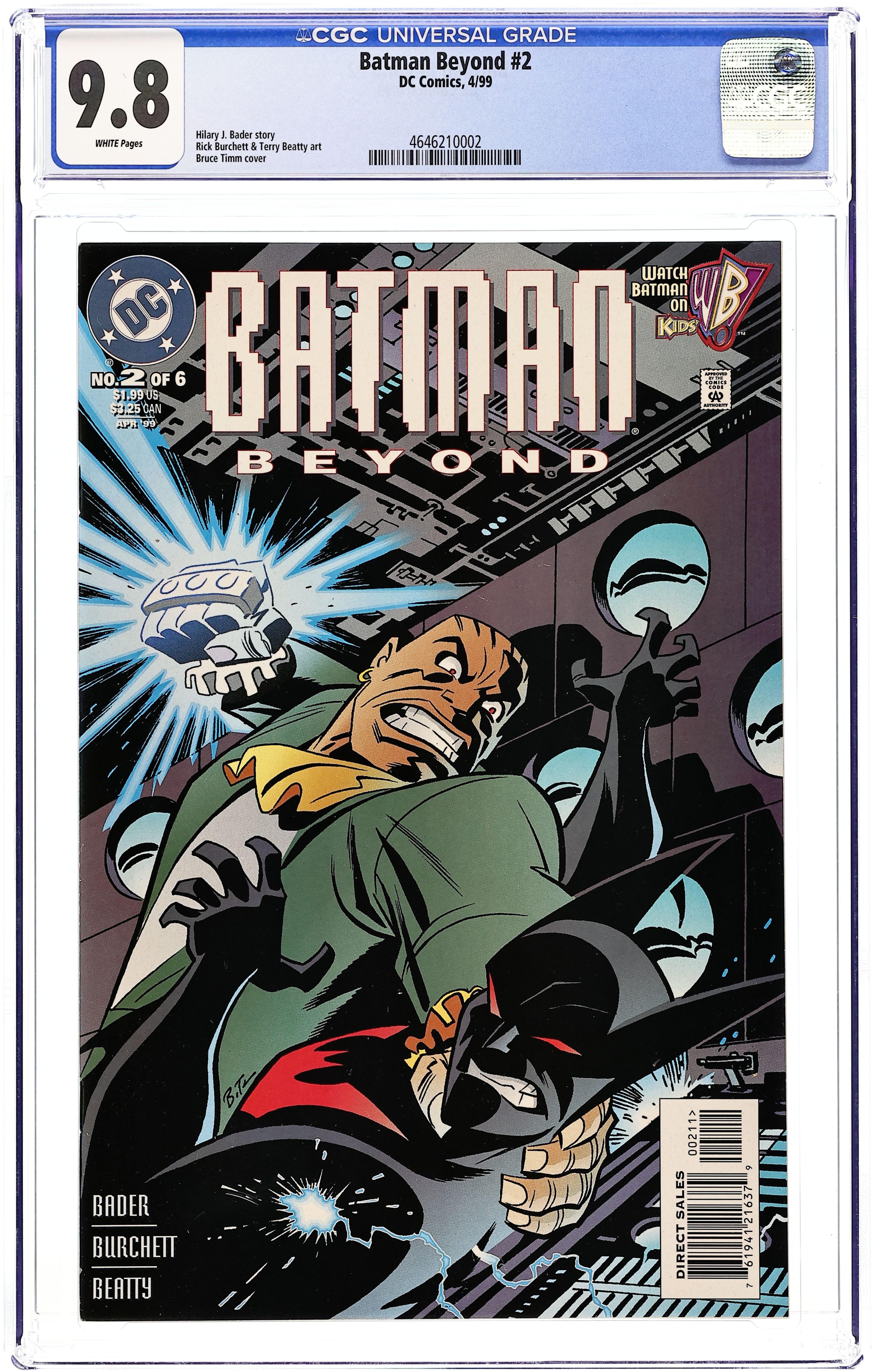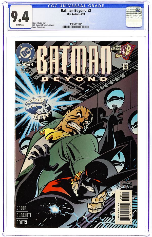 Cover art by Bruce Timm. I Am Batman, script by Hilary J. Bader, pencils by Rick Burchett, inks by Terry Beatty; Though Derek Powers is using Wayne-Powers to make nerve gas, Bruce refuses to act and tells Terry to take the information to Police Commissioner Barbara Gordon; But after leaving Wayne Manor, Terry is confronted by Powers and loses the disc. Terry returns to the Batcave, steals the Batman costume, and heads to Wayne-Powers where he witnesses Powers selling the nerve gas to the Kaznian Minister of Commerce; With Bruce's help through the radio receiver in the costume, Terry eludes Powers and puts a stop to the delivery of the nerve gas; The next day, Bruce offers Terry a job as his assistant. This is adapted from the first episode of the Batman Beyond cartoon. 36 pgs. $1.99. Cover price $1.99.