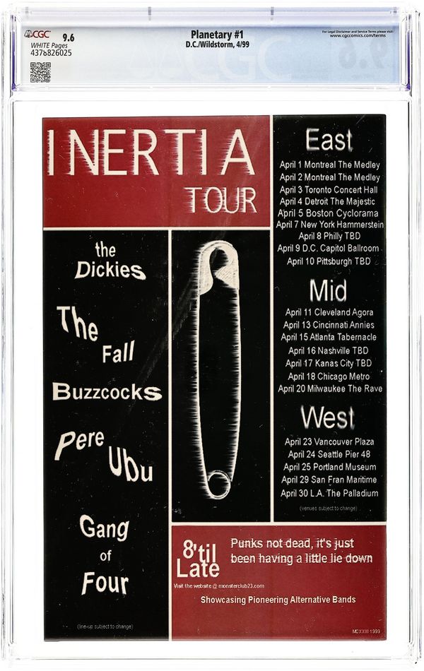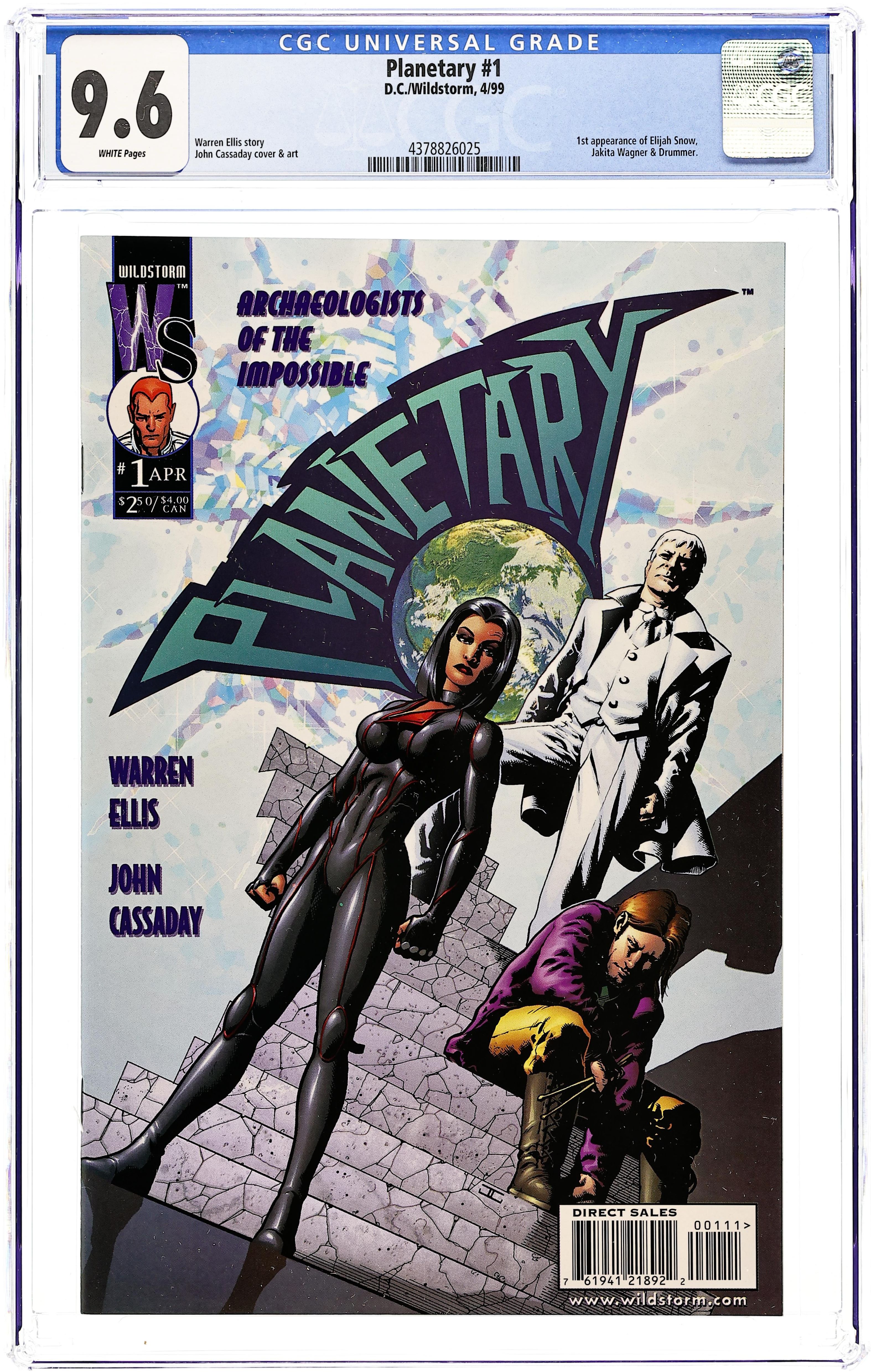 Cover art by John Cassaday. All Over The World, script by Warren Ellis, art by John Cassaday; Elijah Snow is hired by Jakita Wagner to join Planetary, a four-man team (3 field agents and one mysterious backer known as "the Fourth Man")looking to uncover the hidden history of the world as mystery archeologists"; Their first mission: to explore a man-made cavern in the Adirondacks, the last known destination of Doc Brass, an adventurer from the 1930s and 1940s. First introduction of the Snowflake. 36 pgs. Cover price $2.50.
