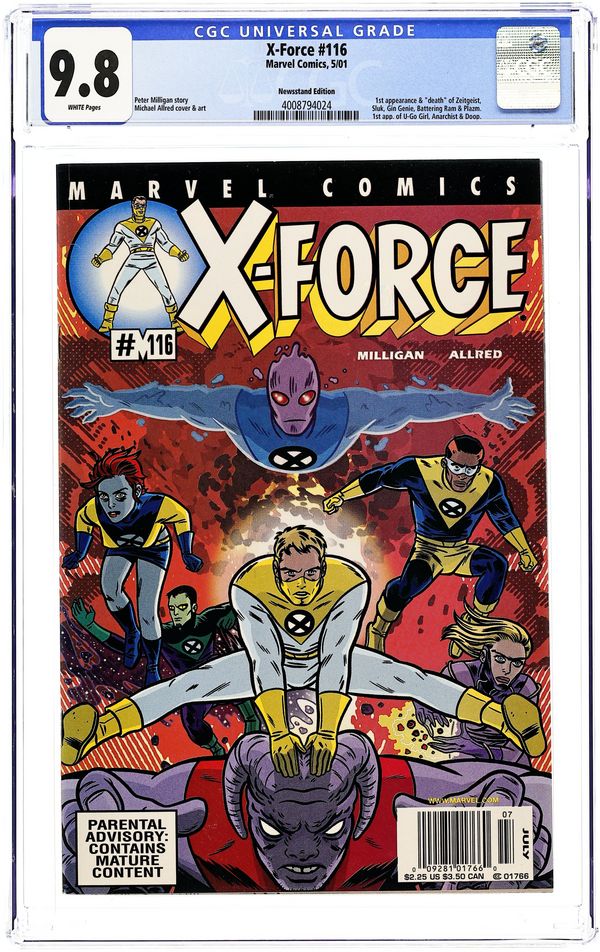 Newsstand Edition. A non-comics code issue due to "mature content," says Marvel. Story by Peter Milligan. Cover and Art by Mike Allred. THE SCOOP: It's a new era for X-FORCE as writer Peter Milligan (Shade The Changing Man, Human Target) and penciler Mike Allred (Madman, Atomics) bring an exciting, controversial and innovative vision to the title! THE STORY: Professor X had a dream, that mutants and humans could live in peace and harmony. A new squad of operatives calling themselves X-Force are living that dream. These eight mutants are cashing in on their special skills to preserve the Free World from the Forces of Evil, but at no small cost to themselves. Adored by humans, reviled by their fellow mutants, X-Force has successfully "crossed over." Problem is, there may be no going back! Meet the new team: Zeitgeist, U-Go Girl, The Anarchist, Battering Ram, Plazm, Gin Genie, La Nuit and their amorphous assistant Doop! Eight mutants who've teamed together to do the big dirty jobs that others can't. Eight mutants who shine in the blinding lights of the media but strike in the dark of night. Eight mutants who've agreed to burn brightly and as you'll see burn fast! Cover price $2.25.