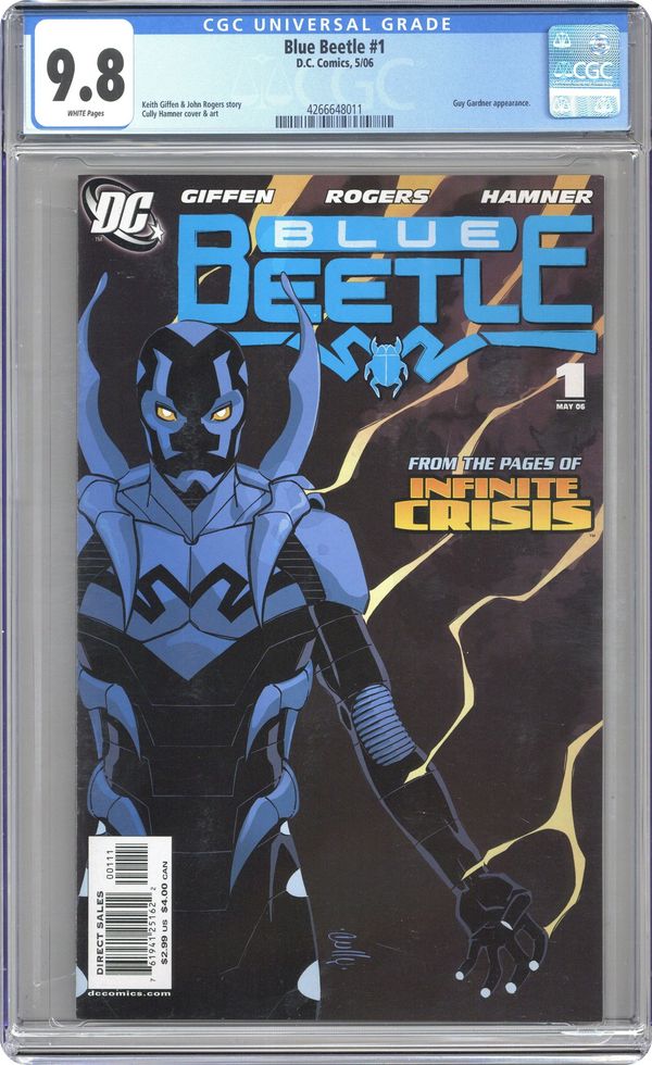 First Printing. Written by Keith Giffen & John Rogers Art and cover by Cully Hamner Keith Giffen (FORMERLY KNOWN AS THE JUSTICE LEAGUE) and hot screenwriter John Rogers (Catwoman) team with Cully Hamner (RED, BATMAN: TENSES) to bring back the Beetle! Tearing its way through the events of DAY OF VENGEANCE and INFINITE CRISIS, the mystical Blue Beetle scarab has chosen its new guardian! But supernatural powers can be a blessing or a curse, and when it comes to the powers of the Scarab, you don't get one without the other. ? 32 pg, FC Cover price $2.99.