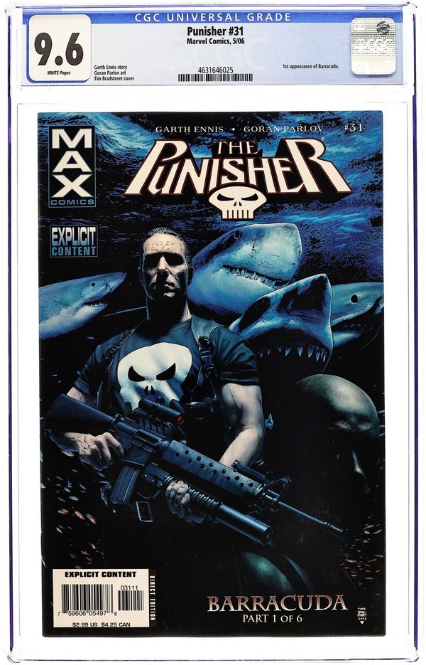 Written by GARTH ENNIS Penciled by GORAN PARLOV Covers by TIM BRADSTREET. "Barracuda," Parts 1 (of 6) Jigsaw, Ma Gnucci, the Russian -- Frank Castle's faced some fearsome foes in his day, but none as stone-cold rotten to the bone as The Barracuda. He's big, he's mean, and the last thing on earth you want is to see him smile. 32 PGS. /MAX - Explicit Content ...$2.99 Cover price $2.99.