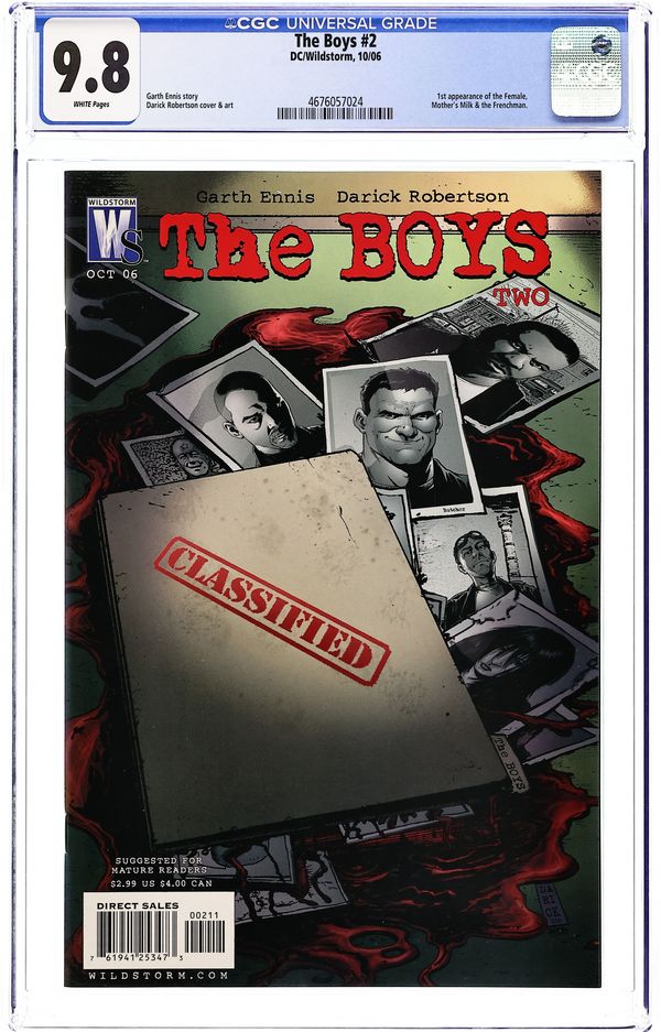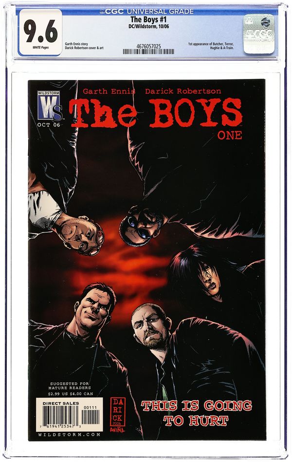 Written by Garth Ennis. Art and covers by Darick Robertson. 'This book will out-PREACHER PREACHER.' - Garth Ennis Garth Ennis (Preacher) and Darick Robertson (Transmetropolitan), co-creators of two of the most thought-provoking comics of the last decade, introduce their first original collaboration for a new monthly series: THE BOYS - a dark, twisted look at super powers, super-people, and the men and women who make sure the world's 'heroes' never go too far. With a quarter-million super-powered beings in the world, someone's got to watch what's going on beneath all those masks and capes. In a U.S.A. uncomfortably like our own, that task falls to The Boys, a government-funded group of operatives dedicated to keeping the 'supes' in line. Team leader Billy Butcher, described by a confidential C.I.A. report as 'the most lethal individual ever encountered by this agency,' is on the hunt for new recruits - but it takes something special to join this outfit. You have to be smart. You have to be strong. And you have to hate supes with every ounce of black passion in your heart. Cover price $2.99.
