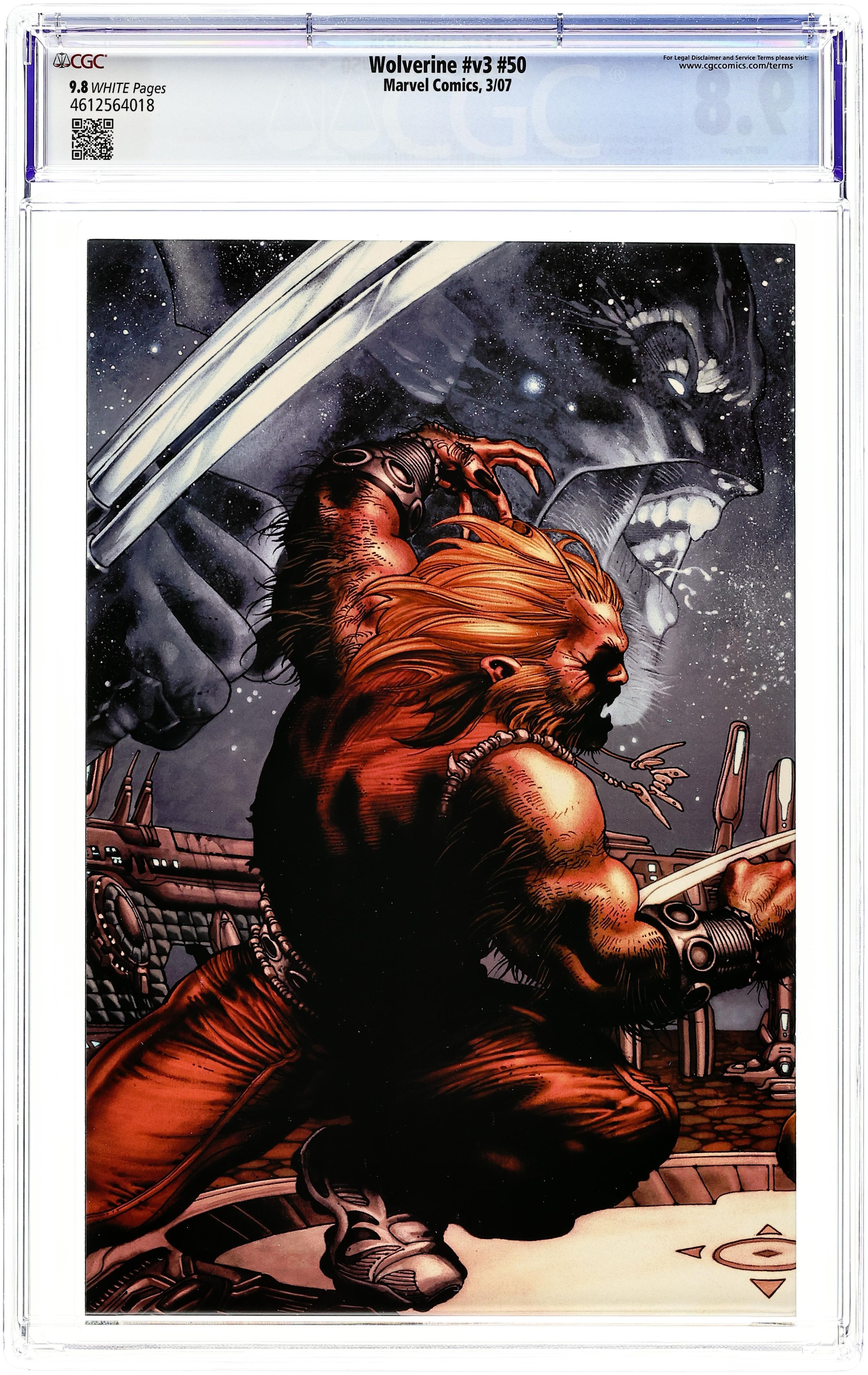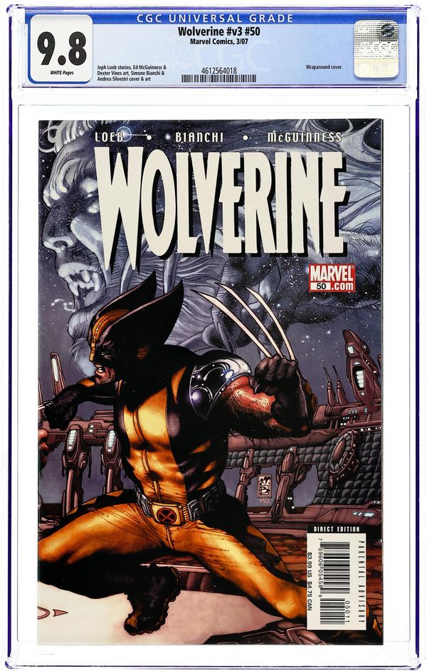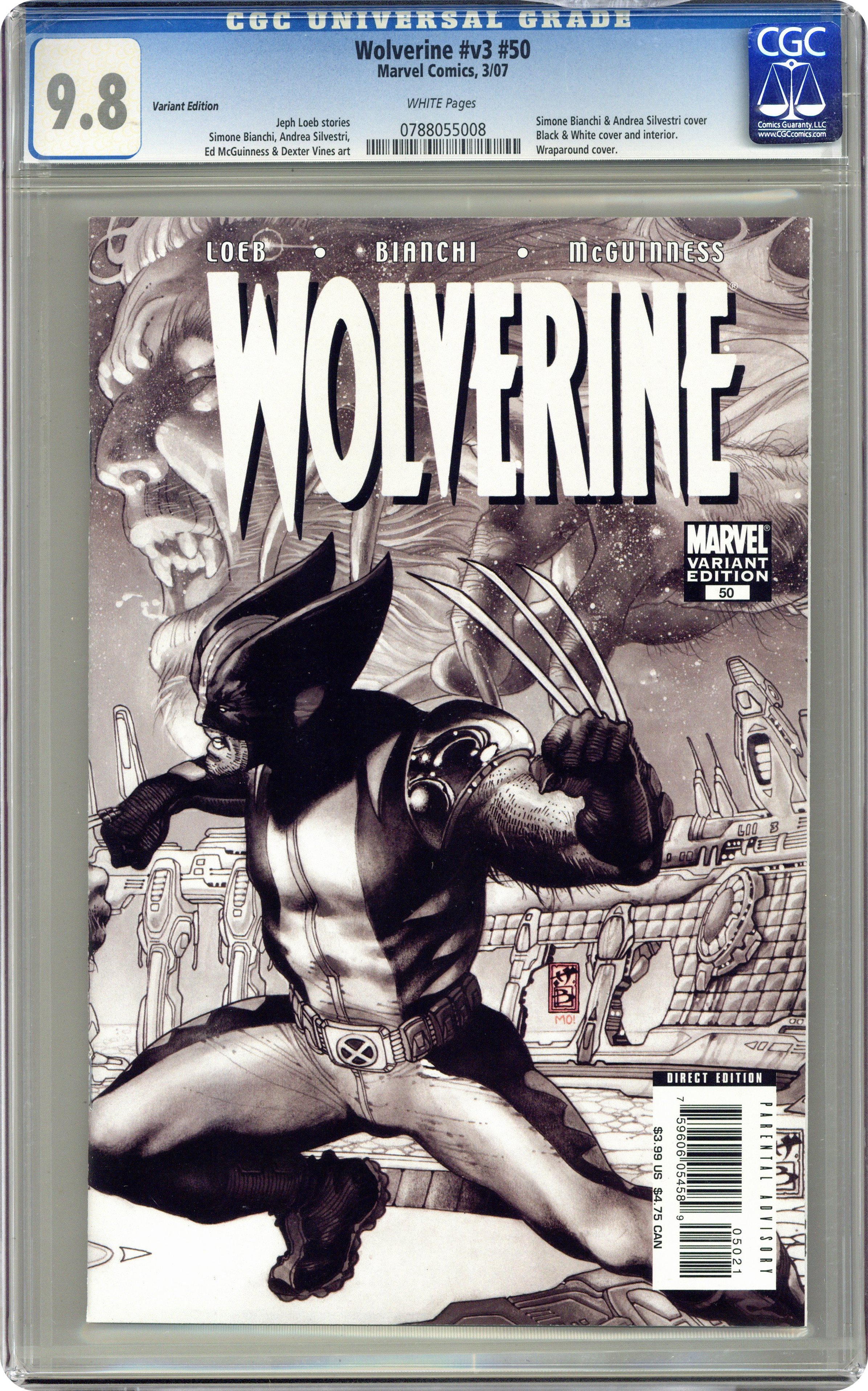 Presented uncolored with a black and white cover. Written by JEPH LOEB Penciled by SIMONE BIANCHI & ED MCGUINNESS Wraparound cover by SIMONE BIANCHI 'EVOLUTION,' PART 1 A DOUBLE-SIZED SPECIAL 50TH ISSUE! WITH SPECTACLAR WRAPAROUND COVER BY BIANCHI! Superstar Jeph Loeb (Batman: Hush) is joined by future superstar Simone Bianchi for the biggest, best and, quite possibly, last battle between Wolverine and Sabretooth! These sworn foes have been locked in an endless grudge match that goes back longer than either can remember -- or even imagine. The key to victory is eons old, and it's certain to rock their world. Think you've seen Marvel's fiercest foes two go toe-to-toe before? Those were just warm-ups. Also featuring a 12-page backup story 'PUNY LITTLE MAN,' by Loeb and superstar Ed McGuinness (Superman/Batman): He's big, he's green, he's mean, and he just got his mitts on Logan. Now THIS is gonna hurt. 48 PGS. Parental Advisory ...$3.99 Cover price $3.99.