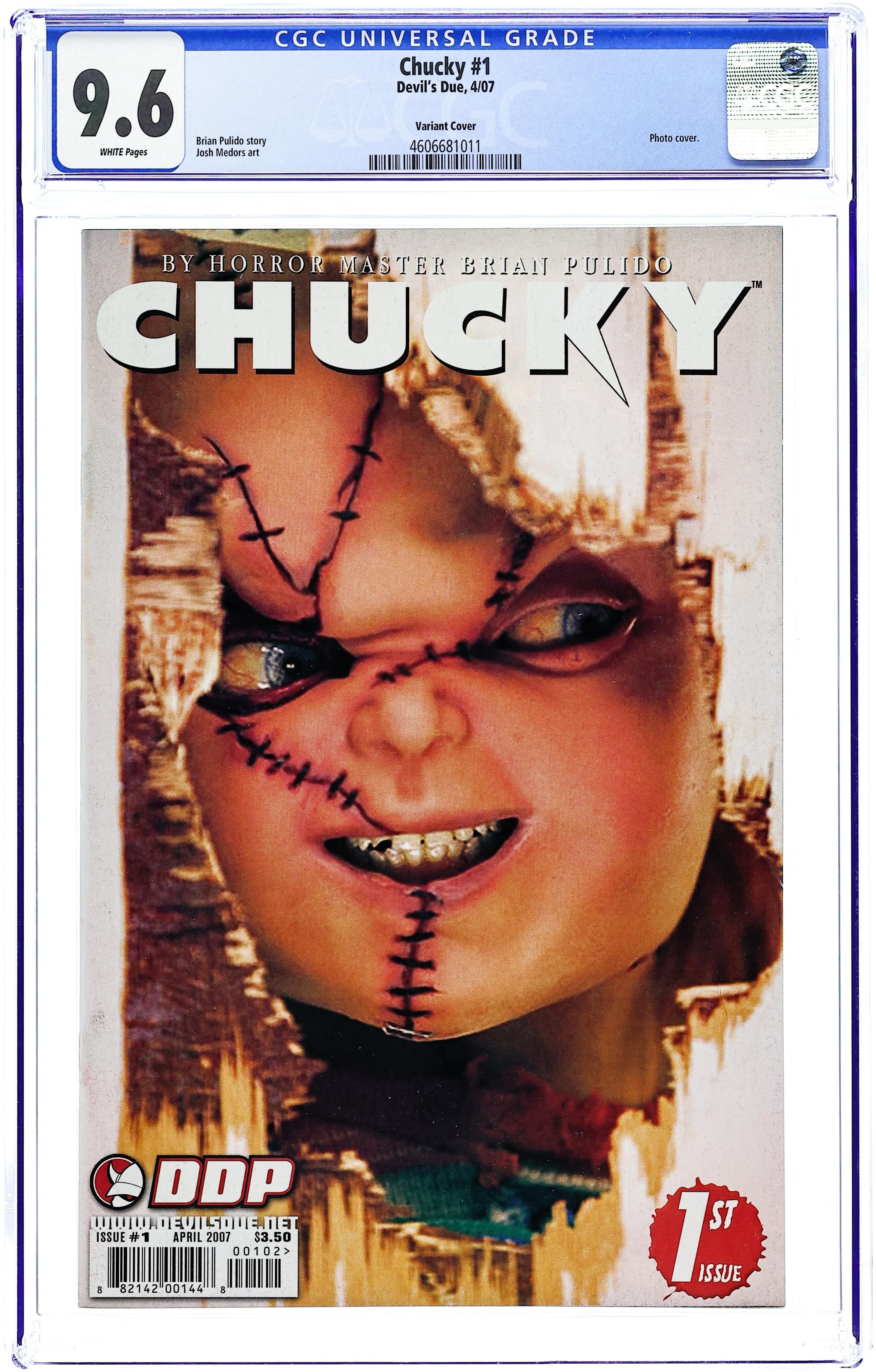 Photo Cover. by Brian Pulido & Josh Medors He's back! Straight from the Child's Play movies, and slashing a bloody swath through comics! Chucky is here! When Chucky sets his sight on a grown up Andy Barclay, the first person to ever encounter the murderous doll, you know that the blood is going to flow! Intense horror in this all-new limited series! Cover price $3.50.
