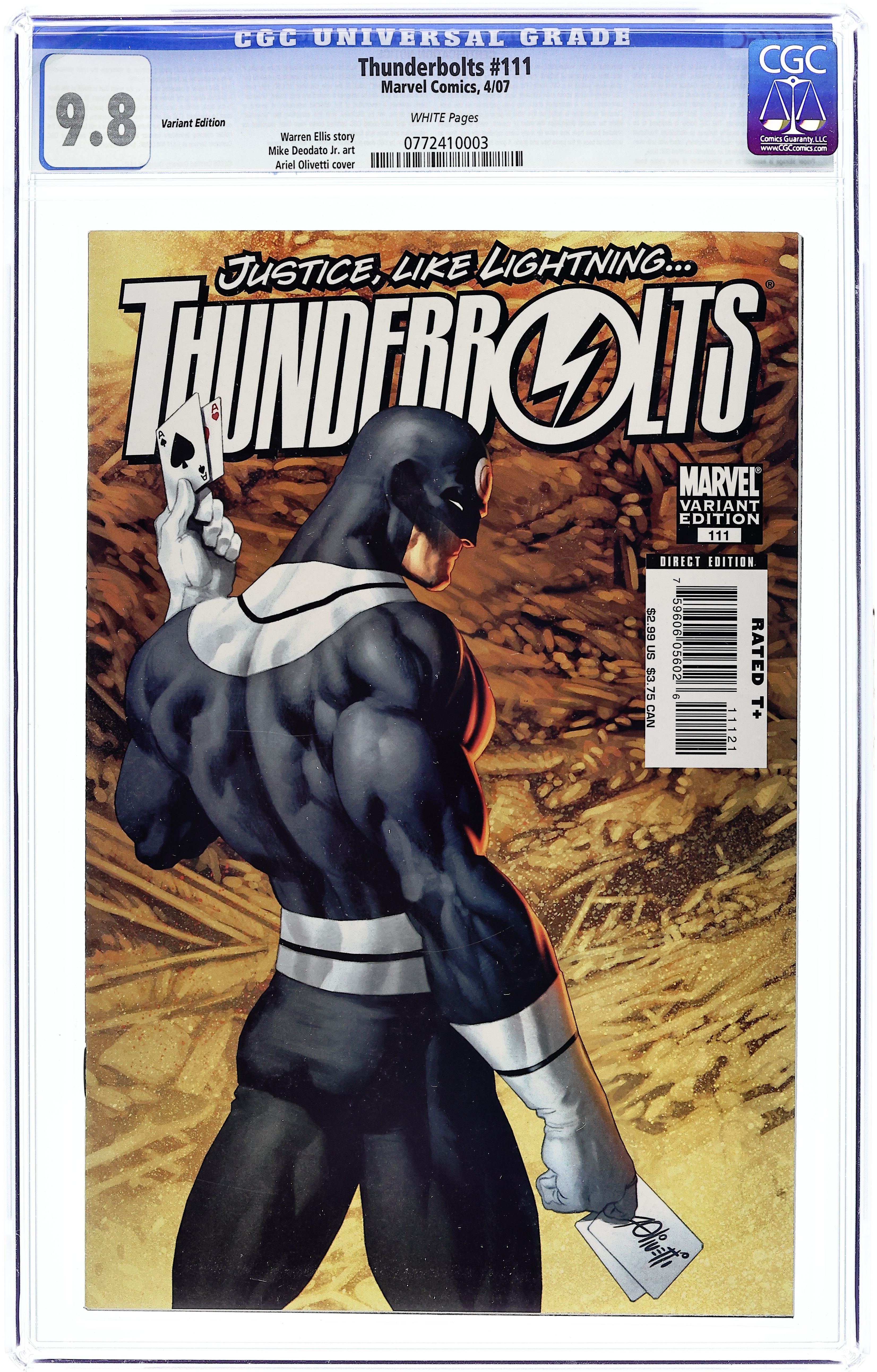 Variant cover by ARIEL OLIVETTI. Written by WARREN ELLIS. Penciled by MIKE DEODATO. Cover by MARKO DJURDJEVIC. Faith in Monsters, Part 2 of 6. The new Thunderbolts embark on a manhunt for Captain America's old sidekick, Jack Flag. Can Jack survive against the raw power of Venom and the cunning of Moonstone? And what has he done to deserve being hunted down? Plus, discover how Songbird ended up a low-ranking member on the team she used to run. 32 PGS./Rated T+ ...$2.99 Cover price $2.99.