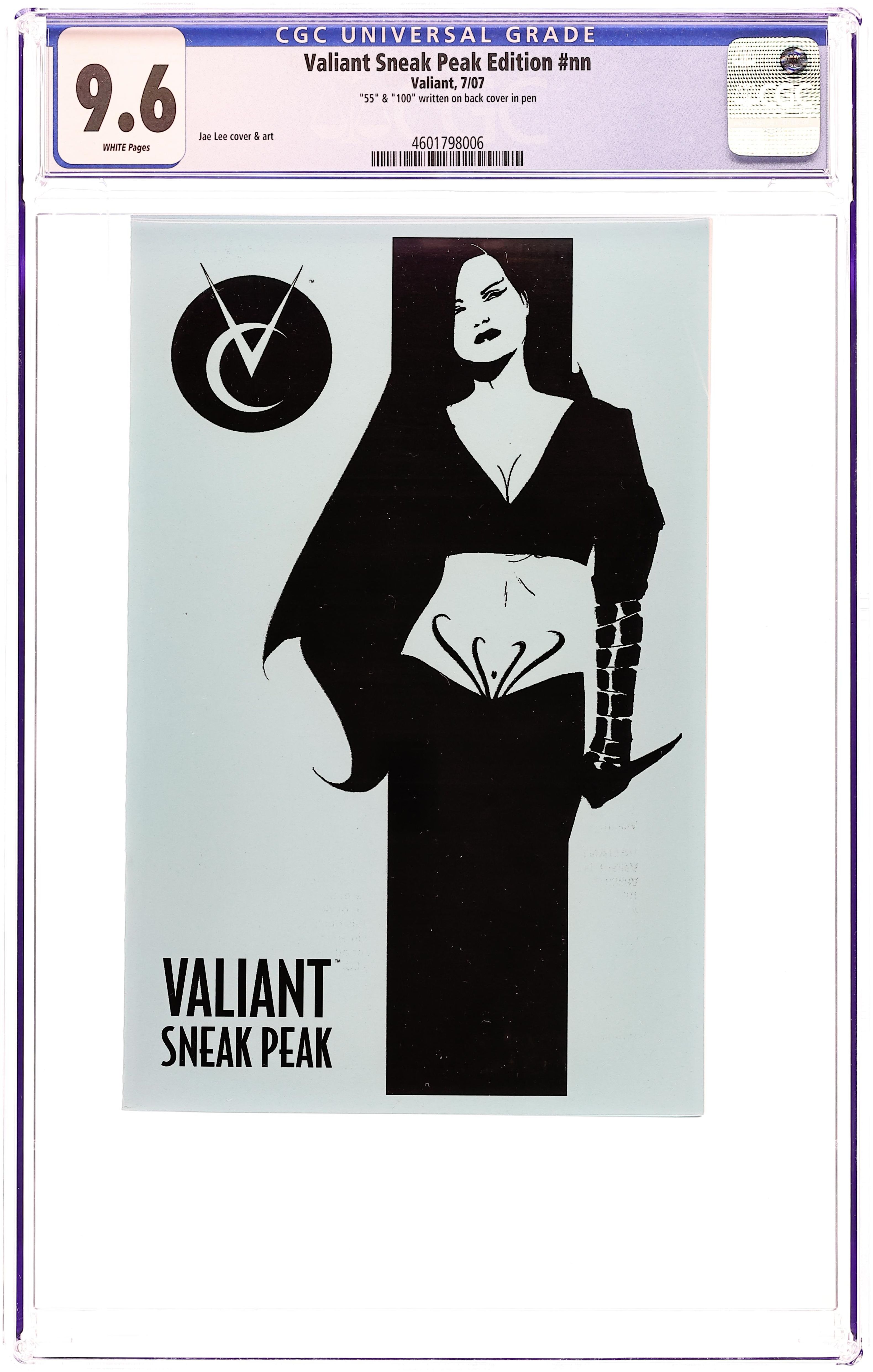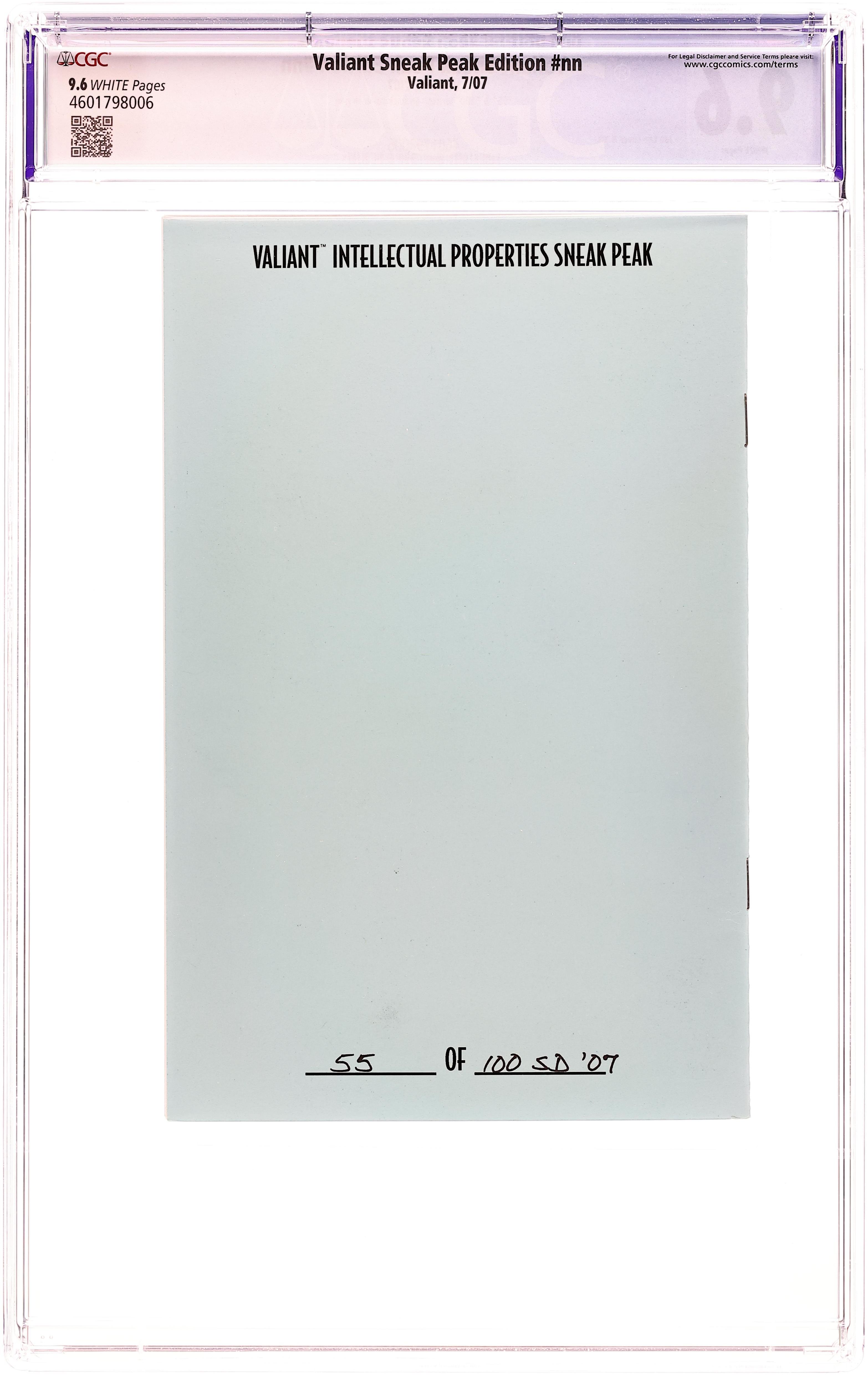 San Diego Comic Con Exclusive Preview Ashcan Numbered & Limited to 100. This was a Dynamic Forces release published by Valiant Intellectual Properties, not by Valiant Entertainment. It features sketches of characters with the same namesakes as the original characters from the Valiant Universe, but often very different character interpretations. These character interpretations never appear anywhere else as VIP eventually lost a legal battle over ownership rights to the trademarked names. 5-1/2" x 3-1/2", b&w, 16 pages. NOTE: Cover title has "Peak" spelled incorrectly, but the error is corrected in the indicia.