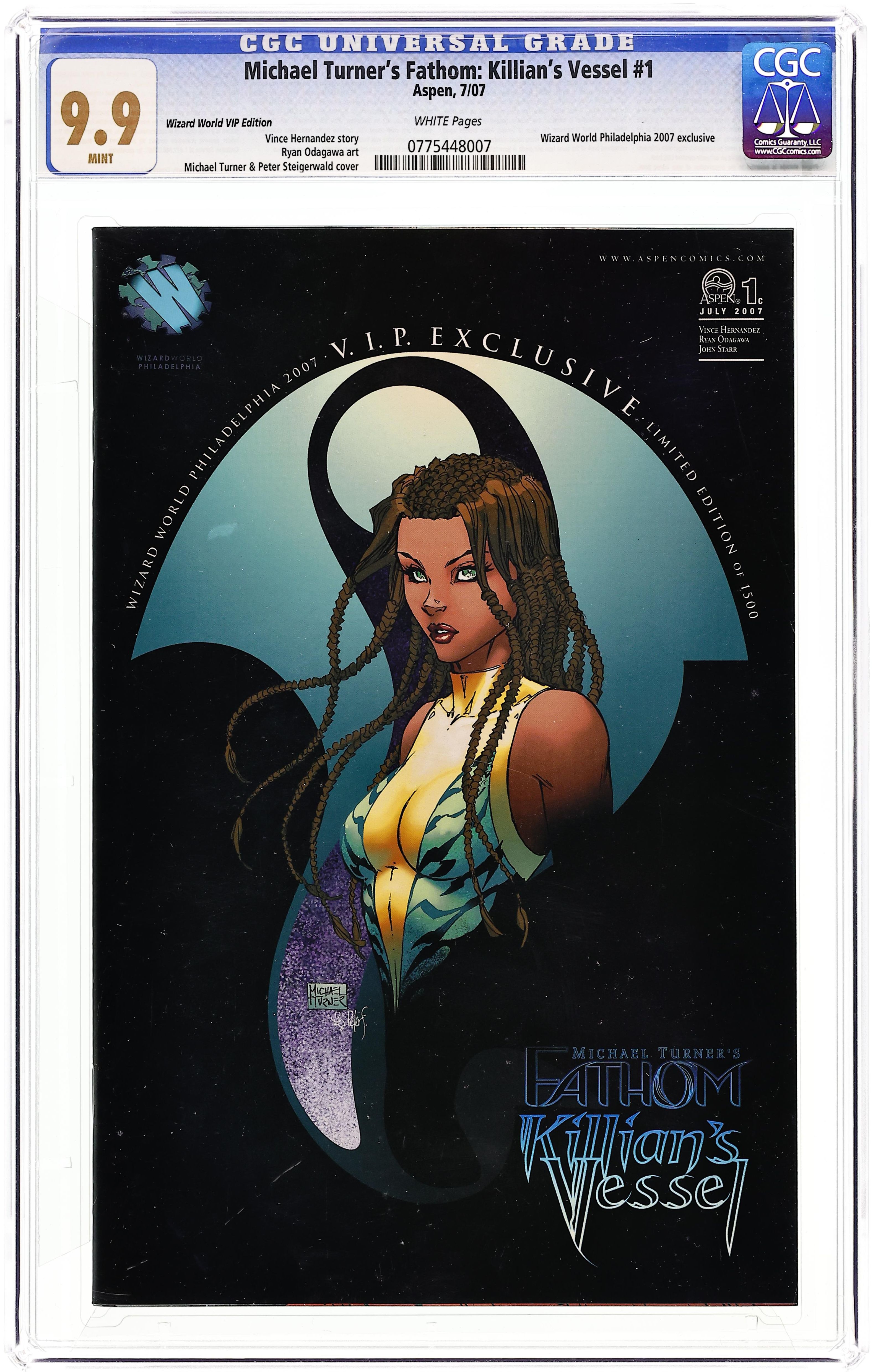 Wizard World Philadelphia 2007 V.I.P. Exclusive Cover by Michael Turner. By Vince Hernandez (w) & Ryan Odagawa (a). Warriors. Fugitives? Discover the secrets behind the blood stained love affair between Fathom's villainous Killian and Anya in this self-contained one-shot special. Ripped from the pages of the original Killian's Tide series, the nefarious Killian finds himself on the run from the Blue as a fugitive, wanted for killing his brother Sear - yet he hasn't lost his appetite for killing humans. But, surrounded by death, the spark of life begins for one of Fathom's most compelling characters! Brought to you through the innovative eyes of artist Sean 'Cheeks' Galloway and Howard Shum, and written by Fathom: Kiani writer Vince Hernandez, Fathom: Killian's Vessel #1 is a must-have for any Fathom fan!