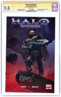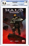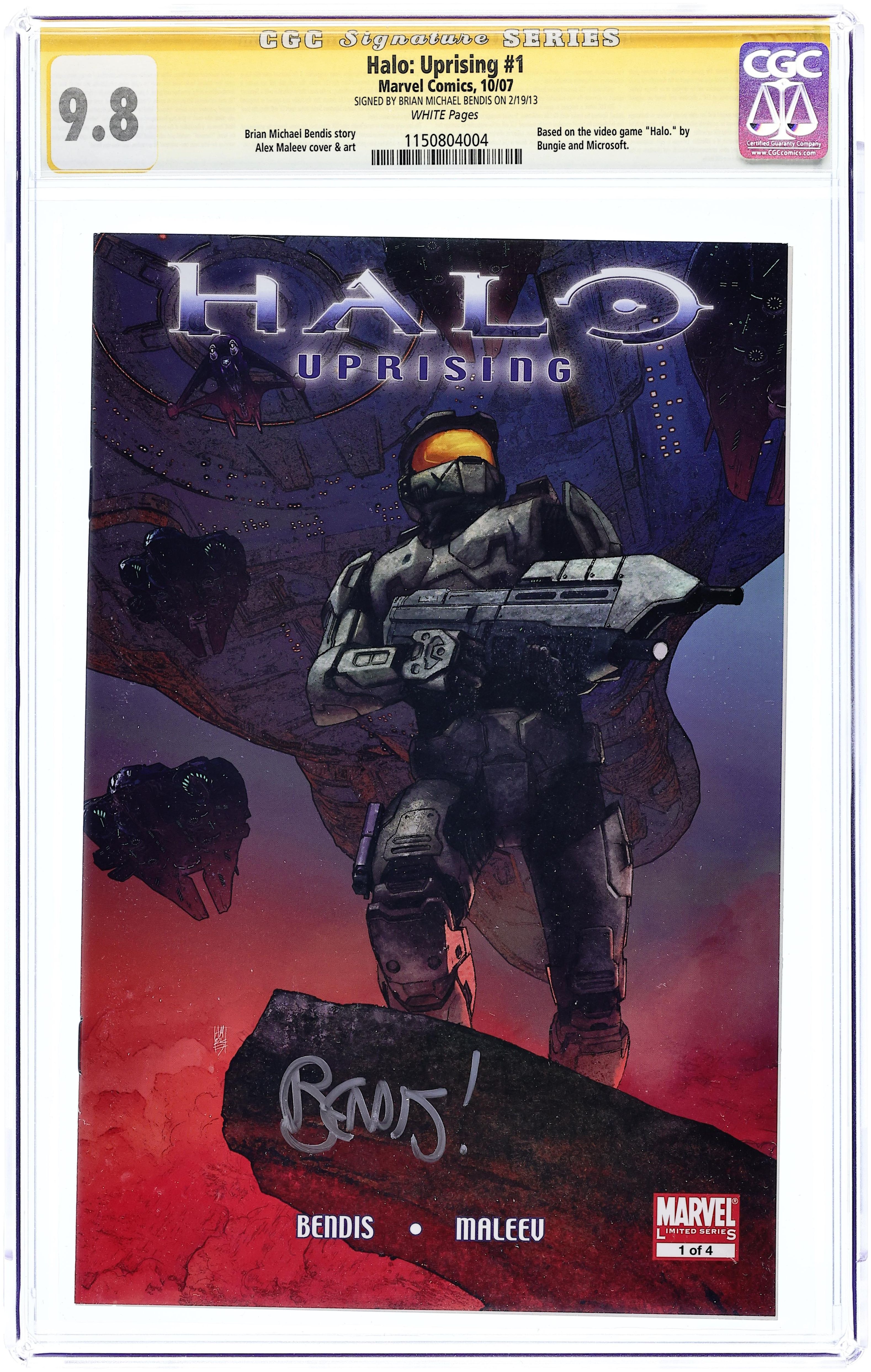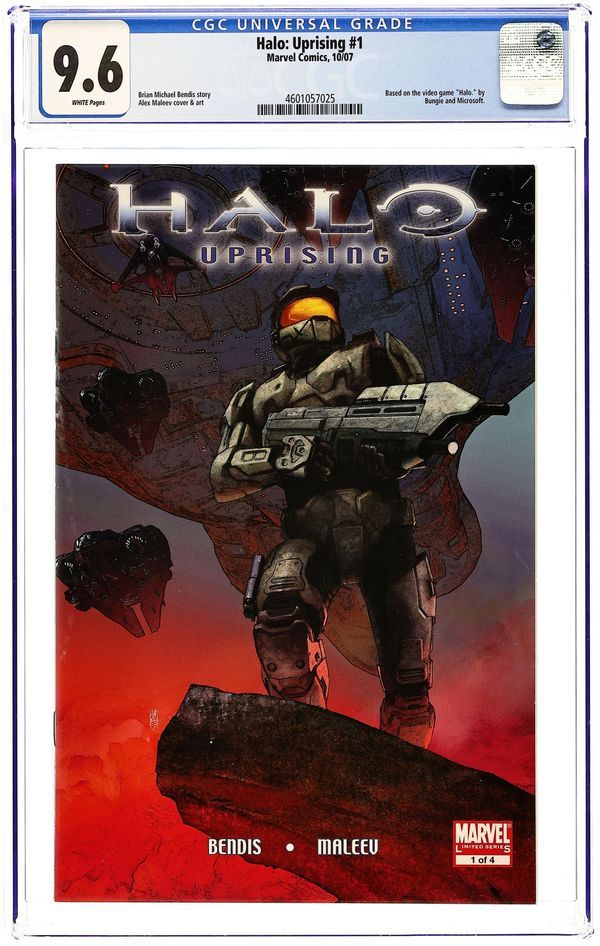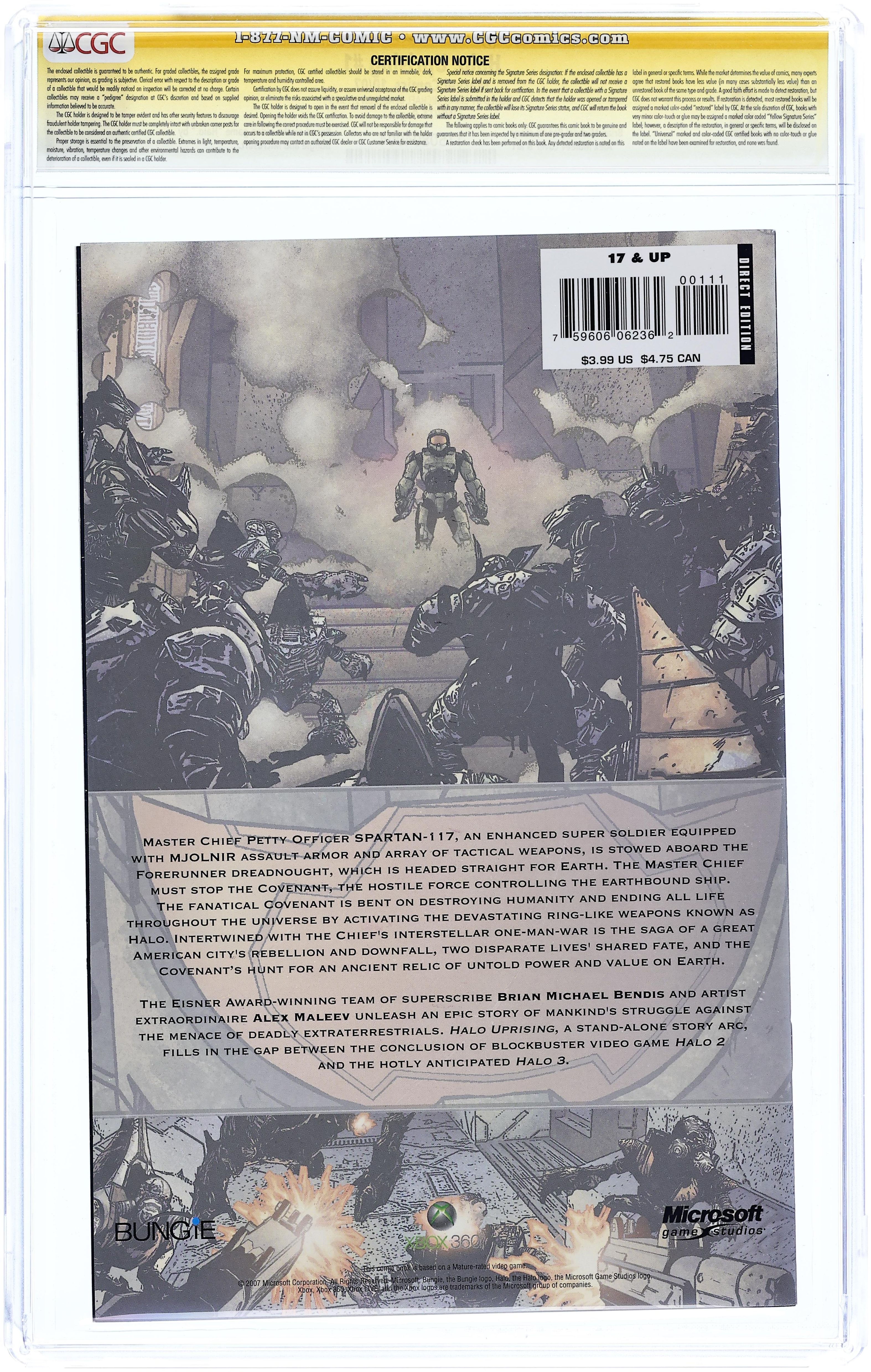 First Printing. Written by BRIAN MICHAEL BENDIS Pencils and Cover by ALEX MALEEV The Eisner Award-winning team of superscribe Brian Michael Bendis and artist extraordinaire Alex Maleev unleash an epic story of mankind's struggle against the alien threat of the Covenant. Picking up from the conclusion of blockbuster video game Halo 2, the must-read issue reveals how the Master Chief, while onboard a hostile ship headed towards Earth, is battling against Covenant forces! Intertwined with Master Chief's interstellar one-man-war is the saga of a great American city's rebellion and downfall, two disparate lives' collision and shared fate, and the Convenant's hunt for an ancient relic of untold power and value. With hope dwindling and the fate of humanity hanging by a thread, is there any chance for a future? Read this debut issue to start the journey into the Halo universe! 40 PGS./17 and Up ...$3.99 This comic book is based on a Mature-rated video game. Microsoft, Bungie, the Bungie logo, Halo, the Halo logos, the Microsoft Game Studios logo, Xbox 360, the Xbox logos are either registered trademarks or trademarks of Microsoft Corporation in the United States and/or other countries and are used under license from owner. © 2007 Microsoft Corporation. All rights reserved. Cover price $3.99.
