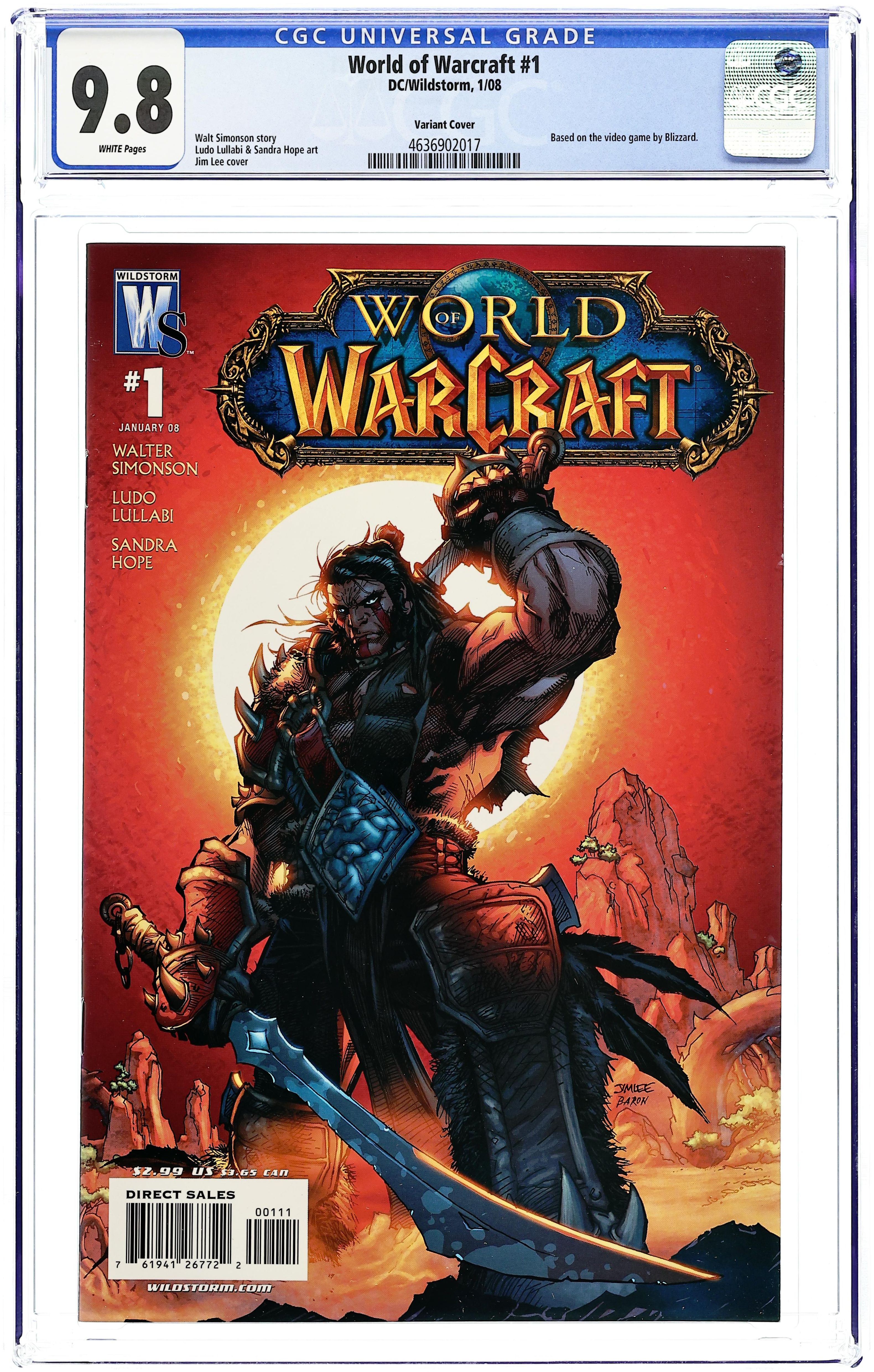 Cover by Jim Lee. Written by Walter Simonson Art by Ludo Lullabi & Sandra Hope. Covers by Jim Lee and Samwise Didier A new ongoing series based on the world's most popular massively multiplayer videogame kicks off with part 1 of a 6-part story arc written by Walter Simonson (SUPERMAN, HAWKGIRL) and illustrated by sensational French artist Ludo Lullabi & Sandra Hope (JUSTICE LEAGUE OF AMERICA)! A human is found unconscious on the shores of Kalimdor, with no memory of who he is or how he arrived there. Enslaved by the Orc Shaman Rehgar Earthfury, this man must fight for survival against members of both the Alliance and the Horde, striking uneasy relationships with other races in his quest to find the secrets of his past! Cover price $2.99.