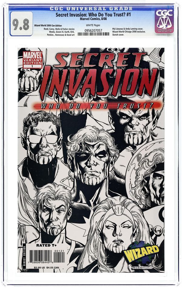 Wizard World Variant. First Printing. Written by ZEB WELLS, BRIAN REED, MIKE CAREY, JEFF PARKER, & CHRISTOS GAGE Penciled by LEONARD KIRK, LEE WEEKS, MIKE PERKINS, & more Cover by PHIL JIMENEZ SECRET INVASION One-Shot! Five stories from across the Marvel Universe, illuminating key elements of the SECRET INVASION! Captain Marvel takes a stand! Marvel Boy makes a choice! Wonder Man and the Beast face off! Abigail Brand, Agent of SWORD finds the foe! And the Agents of Atlas enter the fight! 48 PGS./Rated T+ Cover price $3.99.
