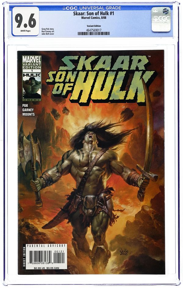 Variant Cover by BORIS VALLEJO AND JULIE BELL. Written by GREG PAK Pencils by RON GARNEY. Born in fire. Raised by monsters. Destined to smash. On an alien planet shattered by war, no one is stronger than Skaar, the savage Son of Hulk. But as a Fillian warlord, an Imperial princess, and a mysterious Earthman spread chaos through the wastelands, will Skaar save the puny survivors -- or eat them? Another epic fever dream from Greg Pak, writer of 'Planet Hulk' and 'World War Hulk' -- featuring the return of fan-favorite Hulk artist Ron Garney! 32 PGS./Rated T+ ...$2.99 Cover price $2.99.
