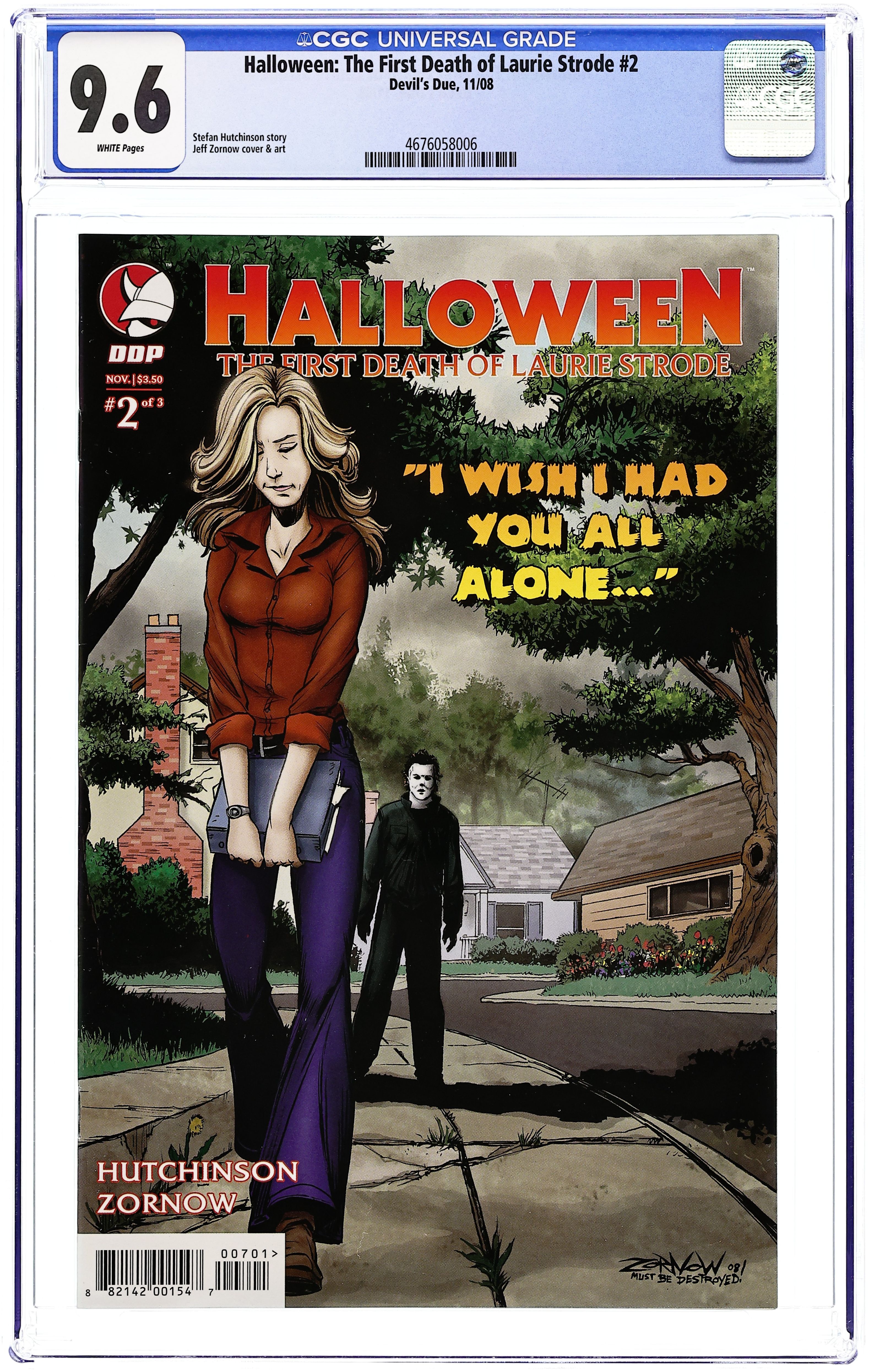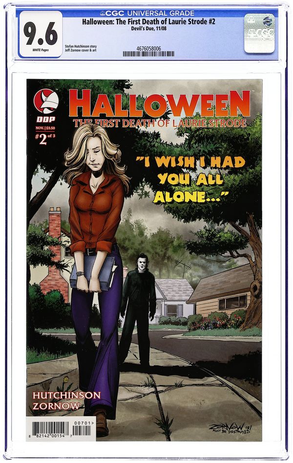 Cover by Jeff Zornow. Author: Stef Hutchinson Artist: Jeff Zornow. Halloween's original troubled damsel continues to reconcile the death of her friends by slipping down into a haze of depression and drugs. The Shape reappears to her on her graduation day, but nobody will heed her calls for help. Dr. Loomis may be her only hope, even as the town's hate for him festers. Intended Audience: Mature Readers: TR 17+ Cover price $3.50.