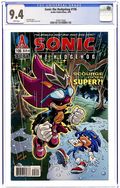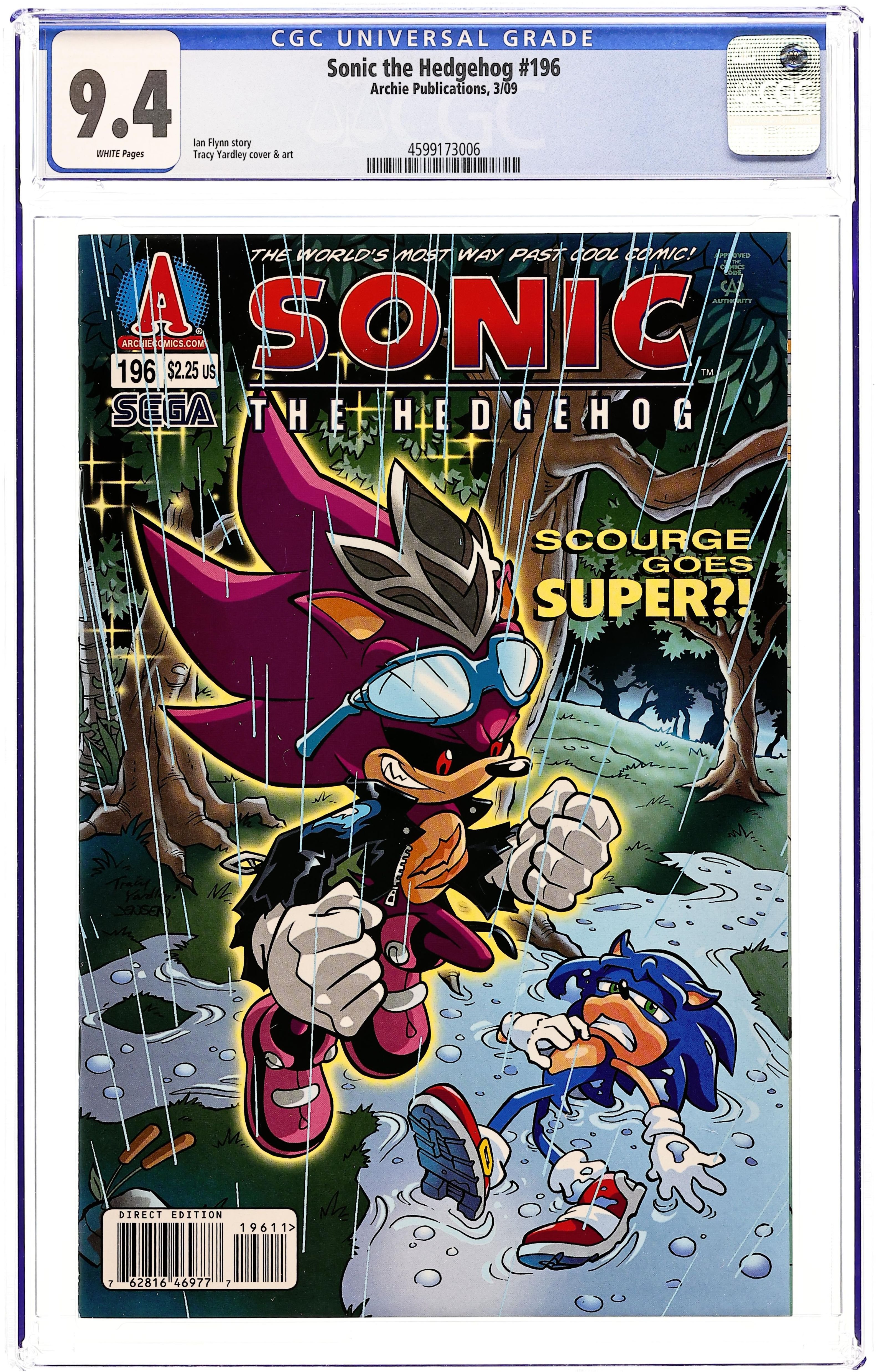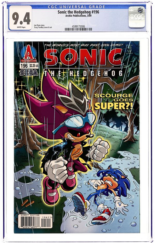 Hedgehog Havoc: Part 2 of 2 -by Ian Flynn & Tracy Yardley The 'New Moebius' saga comes to an explosive end as hero and villain alike tremble at the power of Super Scourge! The fate of two worlds hangs by a thread, but what can Sonic do against his invincible evil twin? You can't miss this epic climax to the biggest Sonic story of the year! Cover price $2.25.
