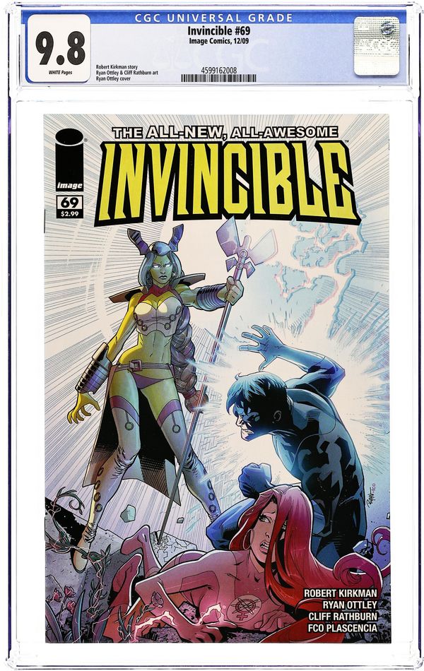 Written by ROBERT KIRKMAN. Art and Cover by RYAN OTTLEY and FCO PLASCENCIA. EVERYTHING IS DIFFERENT NOW! Who is Universa?! Why did she come to this planet in search of the one called Invincible? What does it have to do with the impending Viltrumite Invasion?! And why did she decide to come NOW, on the eve of an attack from the SEQUIDS?! The answers to all these questions and even more questions piled on top of them - in this issue of Invincible! 32 pages, full color. Cover price $2.99.