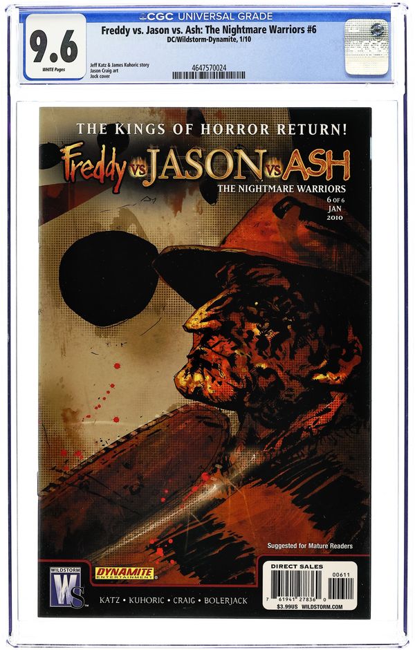 Written by Jeff Katz and James Kuhoric. Art by Jason Craig. Cover by Jock. As the bloody end nears, Ash must lead his remaining forces against the amassed titans of terror. Washington has been leveled, and the odds are stacked against the motley crew of survivors. The vicious battles that end this series are legendary - Tommy Jarvis vs. Jason Voorhees, Ash Williams vs. Freddy Krueger, and even the army of the dead against the ghosts of victims past! 32 pages, full color. MATURE READERS. Cover price $3.99.