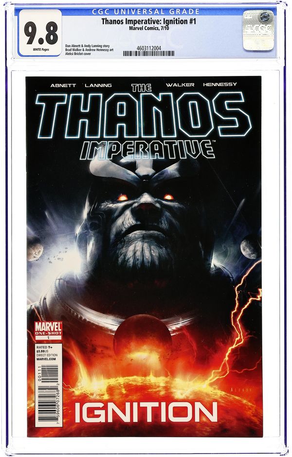 Written by DAN ABNETT and ANDY LANNING. Art by BRAD WALKER. Cover by ALEKSI BRICLOT. Thanos is back! On one side you have the Marvel Universe's #1 threat! On the other: a dark new force determined to obliterate everyone! In the middle are the outnumbered and battle-hardened heroes that stand between us and complete decimation! A war has ignited which will combine the galaxy's most dedicated warriors with a collection of heroes that you never saw coming! It's a battle that will span the cosmos, deliver major shocks, and will prove to you why IGN proclaims 'Dan Abnett and Andy Lanning can seemingly do no wrong' and Aint It Cool News raves that Abnett and Lanning consistently deliver 'terrific action, interesting character development, and some pretty good jokes all rolled into one amazing package.' Cover price $3.99.