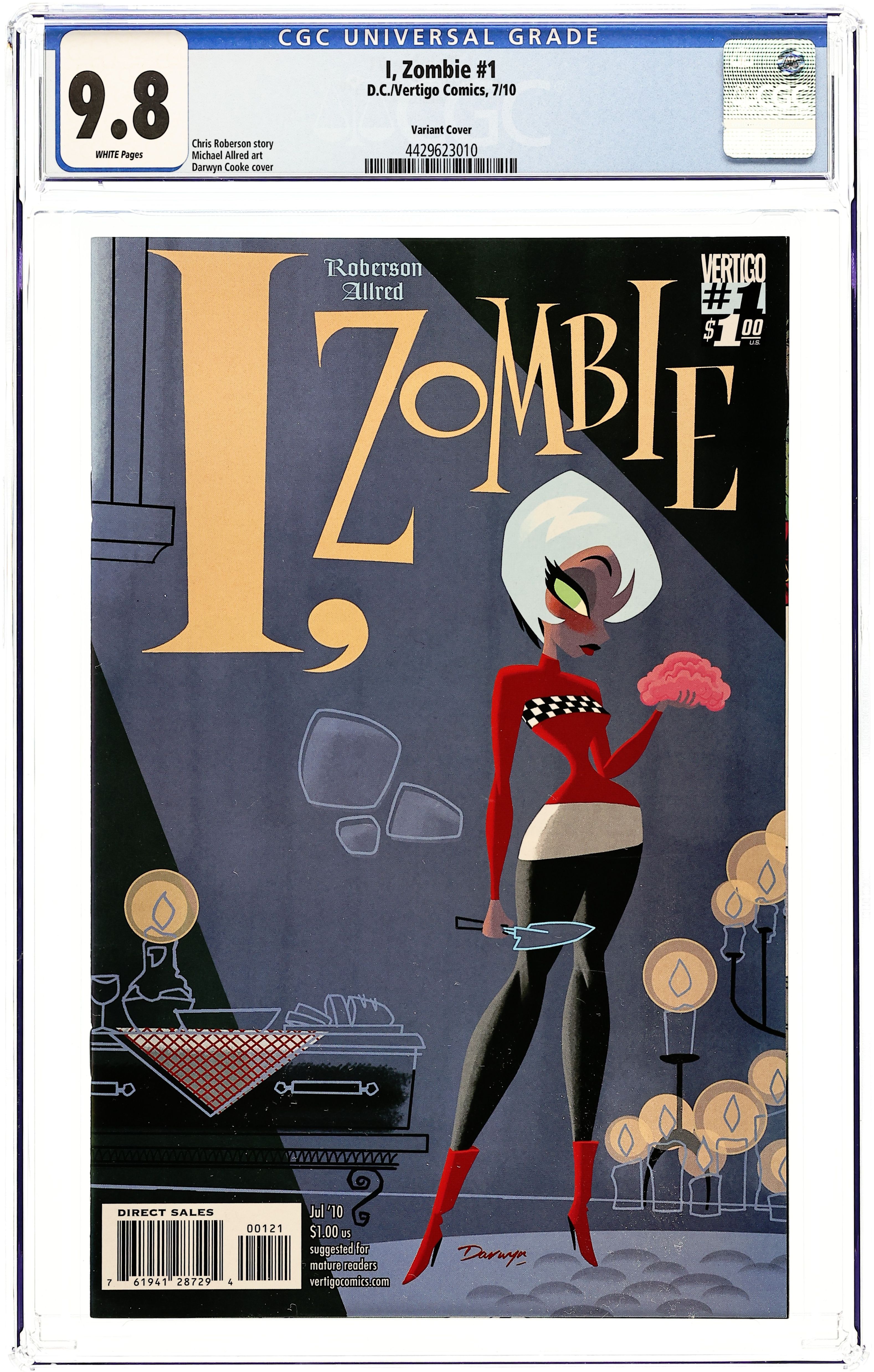 Limited 1 for 10 Variant cover by DARWYN COOKE. Written by CHRIS ROBERSON Art by MICHAEL ALLRED Gwen Dylan is a gravedigger in an eco-friendly cemetery...and a zombie detective. Once a month, she has to eat a human brain - both to keep from going all 'Night of the Living Dead,' and to keep her own memories intact. As a result, Gwen's mind is crowded with the dead person's thoughts. And lately, she feels compelled to fulfill their final requests. Torn between a mysterious mummy and a dashing young monster-hunter, Gwen is set for adventures beyond imagination! A were-terrier, a swinging '60s ghost and a pack of paintball blasting vampires complete the cast of I, ZOMBIE. Written by World Fantasy Award finalist Chris Roberson (CINDERELLA: FROM FABLETOWN WITH LOVE) with art by Eisner Award-winning superstar artist Michael Allred (X-Statix, Madman), I, ZOMBIE is a monster of a tale with razor-sharp prose and powerful pop artistry. Cover price $1.00.