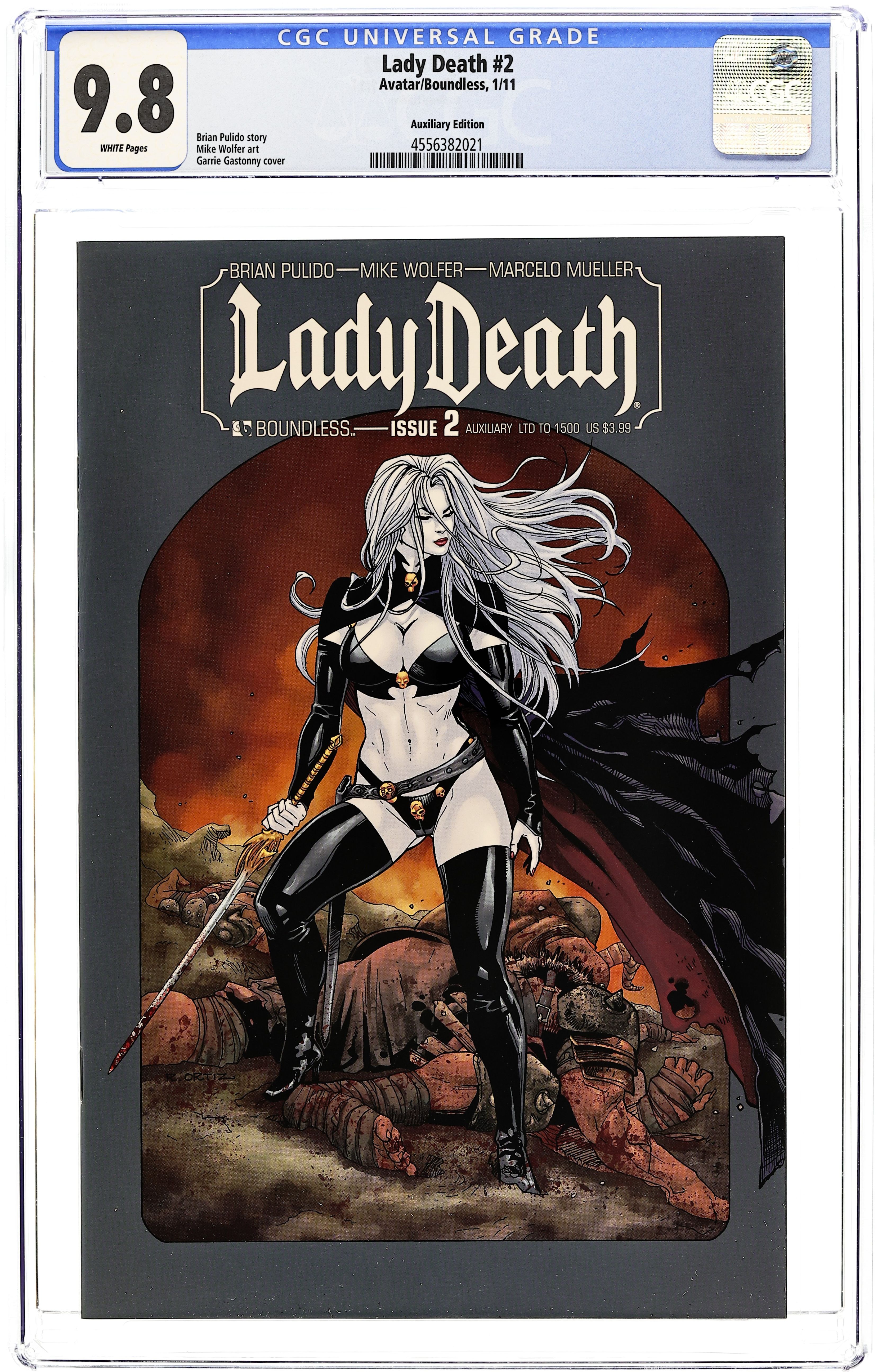 Auxiliary Cover by Richard Ortiz. Limited to 1500 copies. (W) Brian Pulido, Mike Wolfer (A) Marcelo Mueller (C) Garrie Gastonny, Juan Jose Ryp Lady Death is back in an all-new, on-going monthly series! The most popular femme fatale in comics returns with a vicious new tale that delivers for both new and old readers! Lady Death's quest to recover her stolen powers takes her to the shifting and treacherous sands of the Middle East, where monstrous, stinging death awaits her in the Temple of Akrab! Guided by inner visions, Illadra has made her way to the desert, where any number of a dozen fates worse than death can befall the voluptuous thief if she makes one misstep. But even if she makes it across the burning expanse to her goal, will she survive against the guardians of the first shard of her power, creatures warped and corrupted by the very evil which emanates from the piece of Lady Death's lost soul which she hopes to ensnare? Co-written by Mike (Gravel, Wolfskin) Wolfer and original creator Brian Pulido, this series promises to be the most powerful Lady Death tale ever! Cover price $3.99.