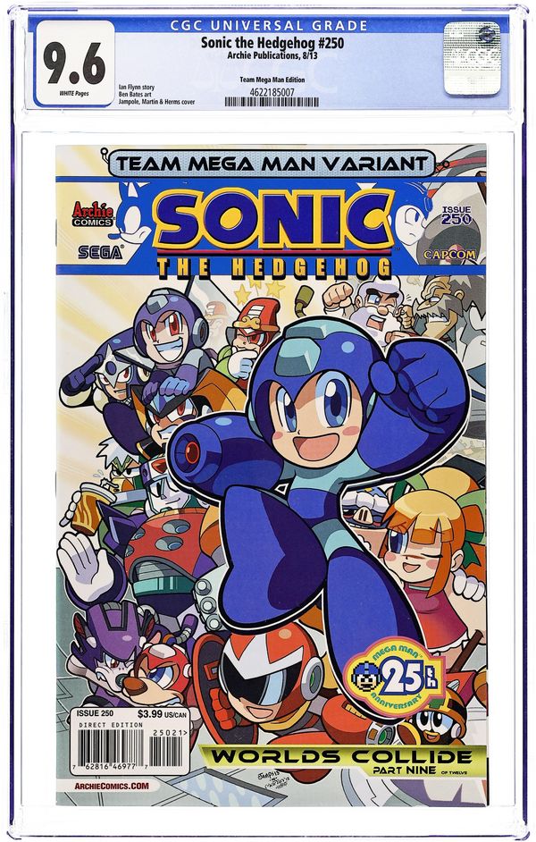 Cover by Ryan Jampole & Various. When Worlds Collide: Part 9 of 12 - (W) Ian Flynn (A) Ben Bates & Various. Celebrate 250 issues of the longest-running video game based comic series, Sonic the Hedgehog, with 'When Worlds Collide' Part Nine of Twelve! The final act of the crossover mega-event starts here as Sonic and Mega Man stand united against the Wily Egg - and backing them up are all their heroic friends. Standing against them are the Robot Masters-all of them! Let the battle begin! At a whopping 48 pages, this double-sized issue features a special, digitally remastered re-presentation of the first Sonic the Hedgehog issue! Also featuring a stunning new wrap-around cover by Patrick 'SPAZ' Spaziante. Plus, choose your favorite hero with the 'Team Sonic' and 'Team Mega Man' CHIBI variant covers! Continued in this month's Mega Man #27! Cover price $3.99.
