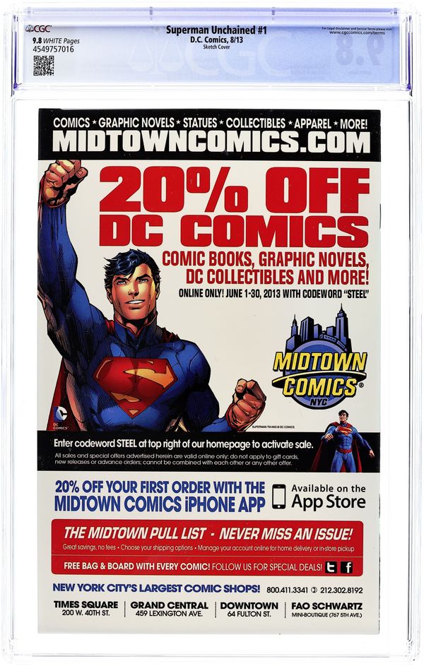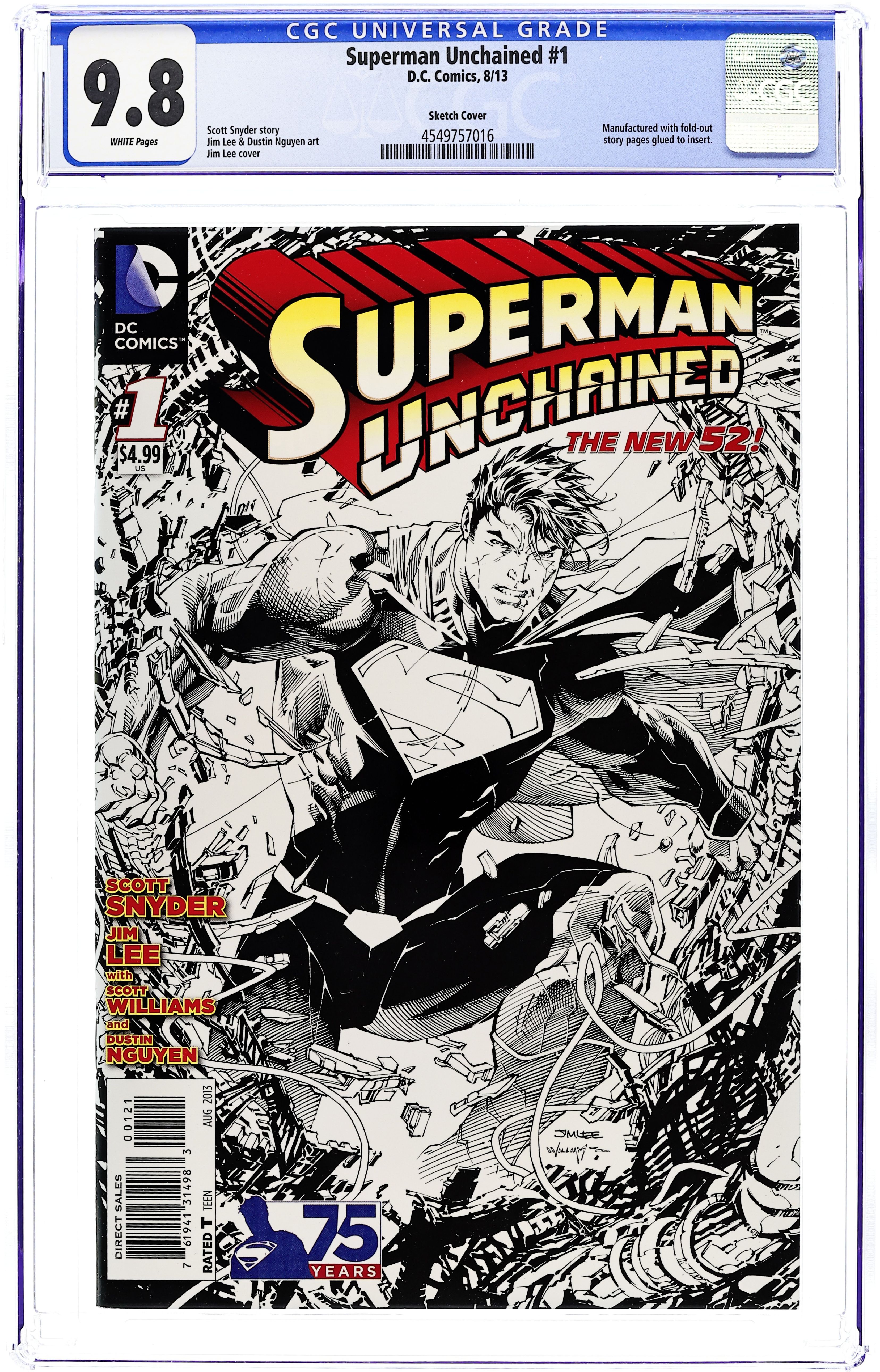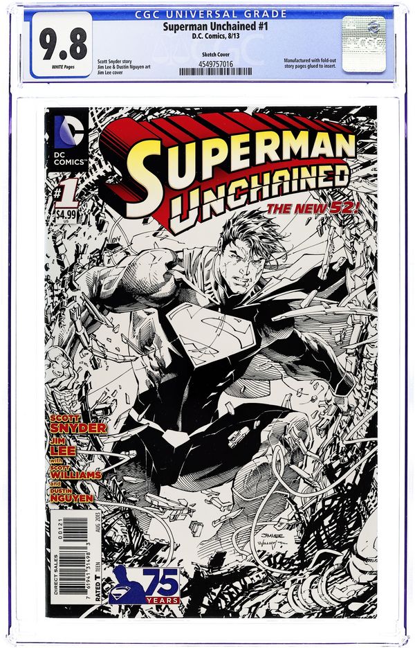 San Diego Comic Con Exclusive B&W Sketch Variant Cover by Jim Lee. (W) Scott Snyder. (A) Jim Lee, Dustin Nguyen, Scott Williams. When thirteen satellites fall from the sky in one day, the logical suspect is Lex Luthor-even though he's still locked up in prison! But a stranger question remains: If Superman didn't stop the last satellite from falling, who did? There's a mystery hidden where even Superman can't see it-Can The Man of Steel drag a decades-old secret into the light? Don't miss the debut of this red-hot new series from two of comics' brightest superstars: SCOTT SNYDER and JIM LEE! This debut issue also includes a bonus two-sided, tipped-in poster that is part of the reading experience and can be easily removed for display! Plus: a 4-page interview with Scott Snyder and Jim Lee!