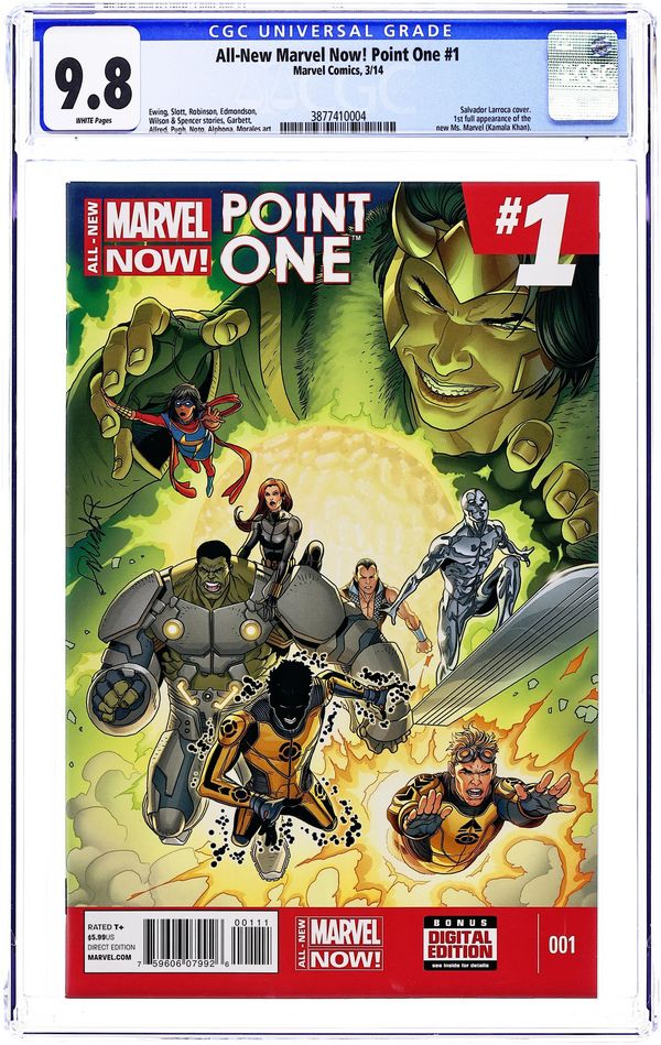 Cover by Salvador Larroca. Written by Al Ewing, Dan Slott, James Robinson, Nathan Edmondson, G. Willow Wilson, Nick Spencer. Art by Lee Garbett, Michael Allred, Steve Pugh, Phil Noto, Adrian Alphona, Rags Morales. Here we go again! It's your one-stop entry point to the world of ALL-NEW MARVEL NOW! Loki embarks on a mission for Asgard! The Silver Surfer and Dawn experience the cosmic rays of Nautikos! A Kree Pursuer and her Special Forces team prepare to invade the Earth! The Black Widow goes undercover in Russia! Who is the new Ms. Marvel? And can even the Indestructible Hulk survive the aid and assistance of fellow Avengers Cannonball and Sunspot? • Features completely new LOKI: AGENT OF ASGARD, SILVER SURFER, BLACK WIDOW, MS MARVEL, ALL-NEW INVADERS and AVENGERS WORLD lead-in stories! Note: First appearance of Kamala Khan as Ms. Marvel Cover price $5.99.