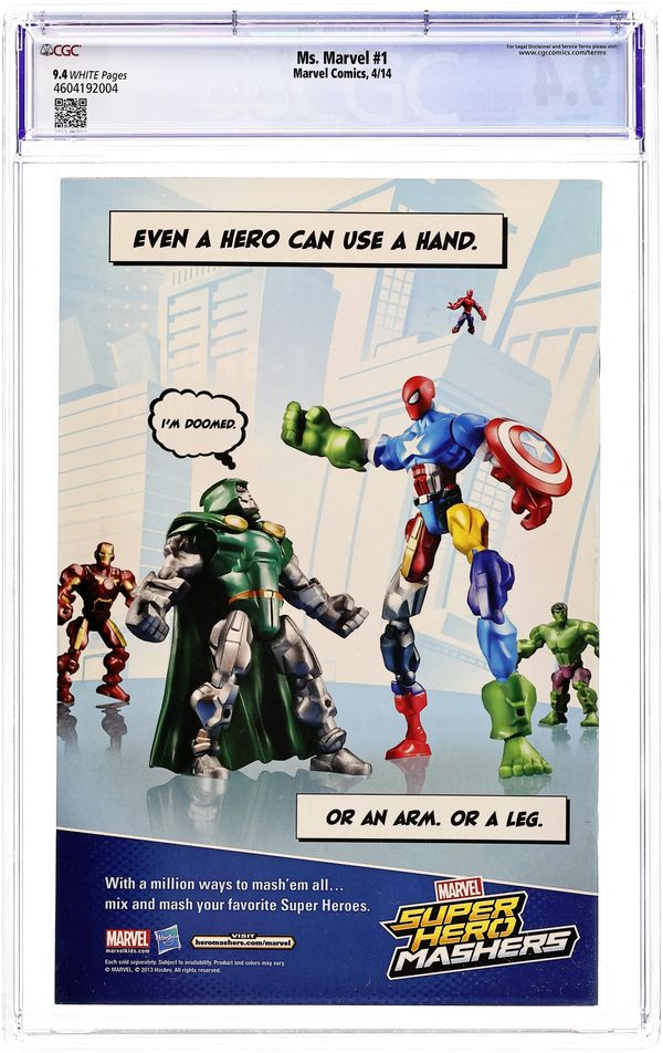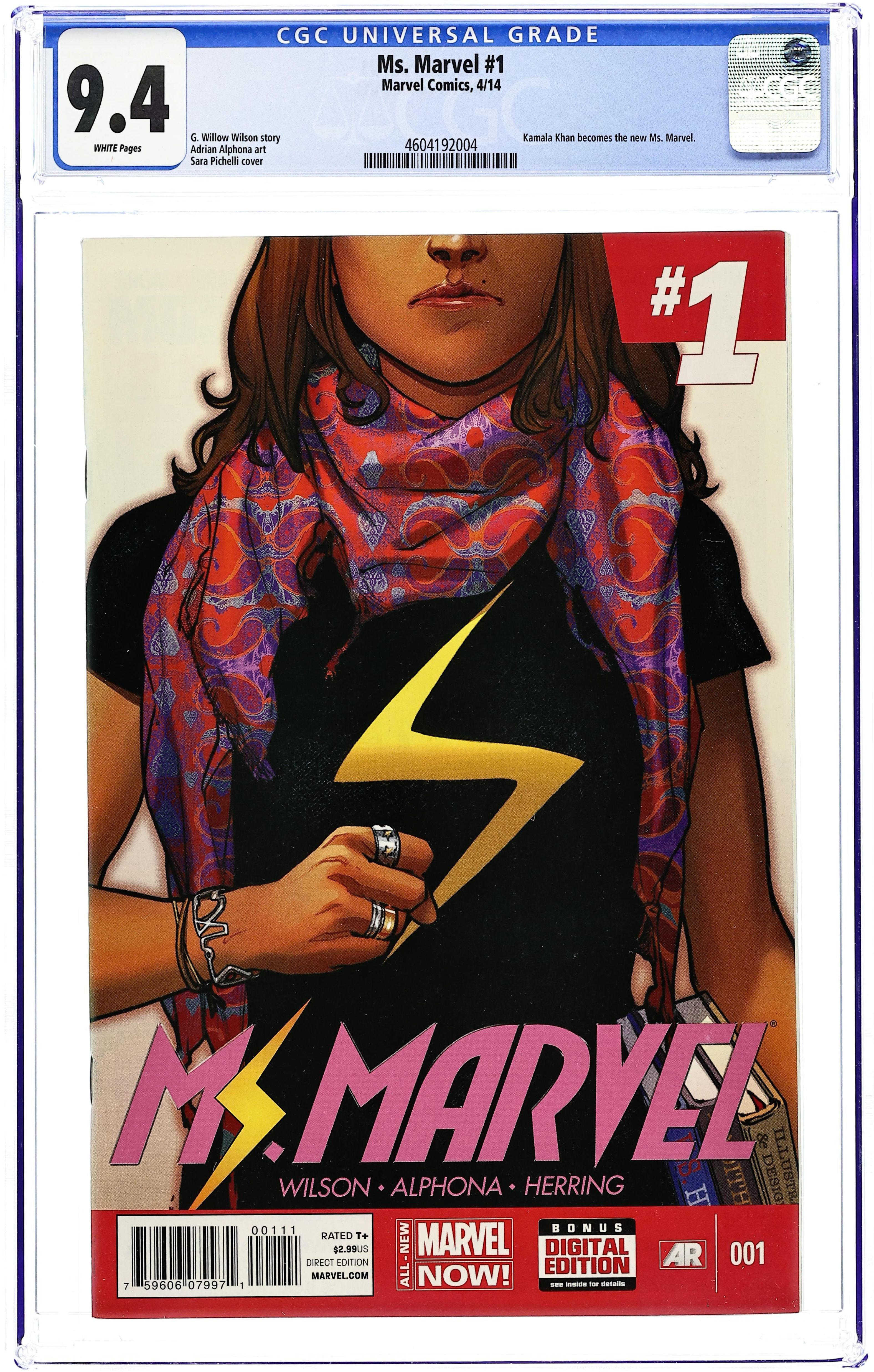 Cover by Sara Pichelli. Written by G. Willow Wilson. Art by Adrian Alphona. The legend has returned! Marvel Comics presents the all-new MS. MARVEL, the ground breaking heroine that has become an international sensation! Kamala Khan is just an ordinary girl from Jersey City--until she is suddenly empowered with extraordinary gifts. But who truly is the all-new Ms. Marvel? Teenager? Muslim? Inhuman? Find out as she takes the Marvel Universe by storm, and prepare for an epic tale that will be remembered by generations to come. History in the making is NOW! Cover price $2.99.