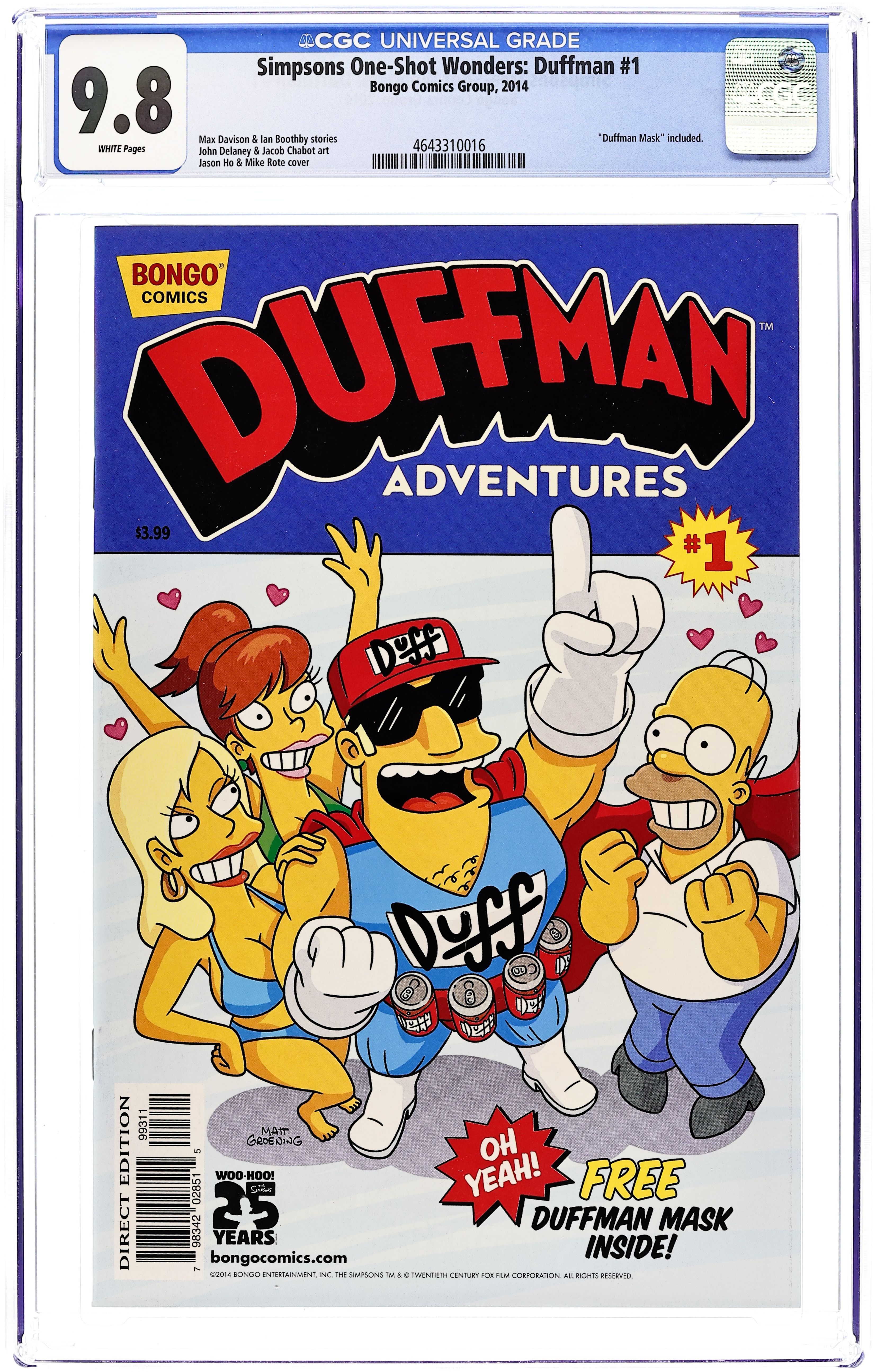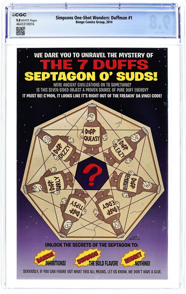 Story and Art by Matt Groening. Cover by Mike Rote. Get ready to be blown away by the book you never thought you'd see! We asked which character you wanted us to feature in our next One-Shot Wonder and the answer was a resounding, 'Duffman!' The masses have spoken! Now the big question is, can Bongo deliver an awesome issue devoted to Springfield's most one-dimensional and underdeveloped character? We've got two words for you: Oh Yeah! 28 pages, full color. Cover price $3.99.