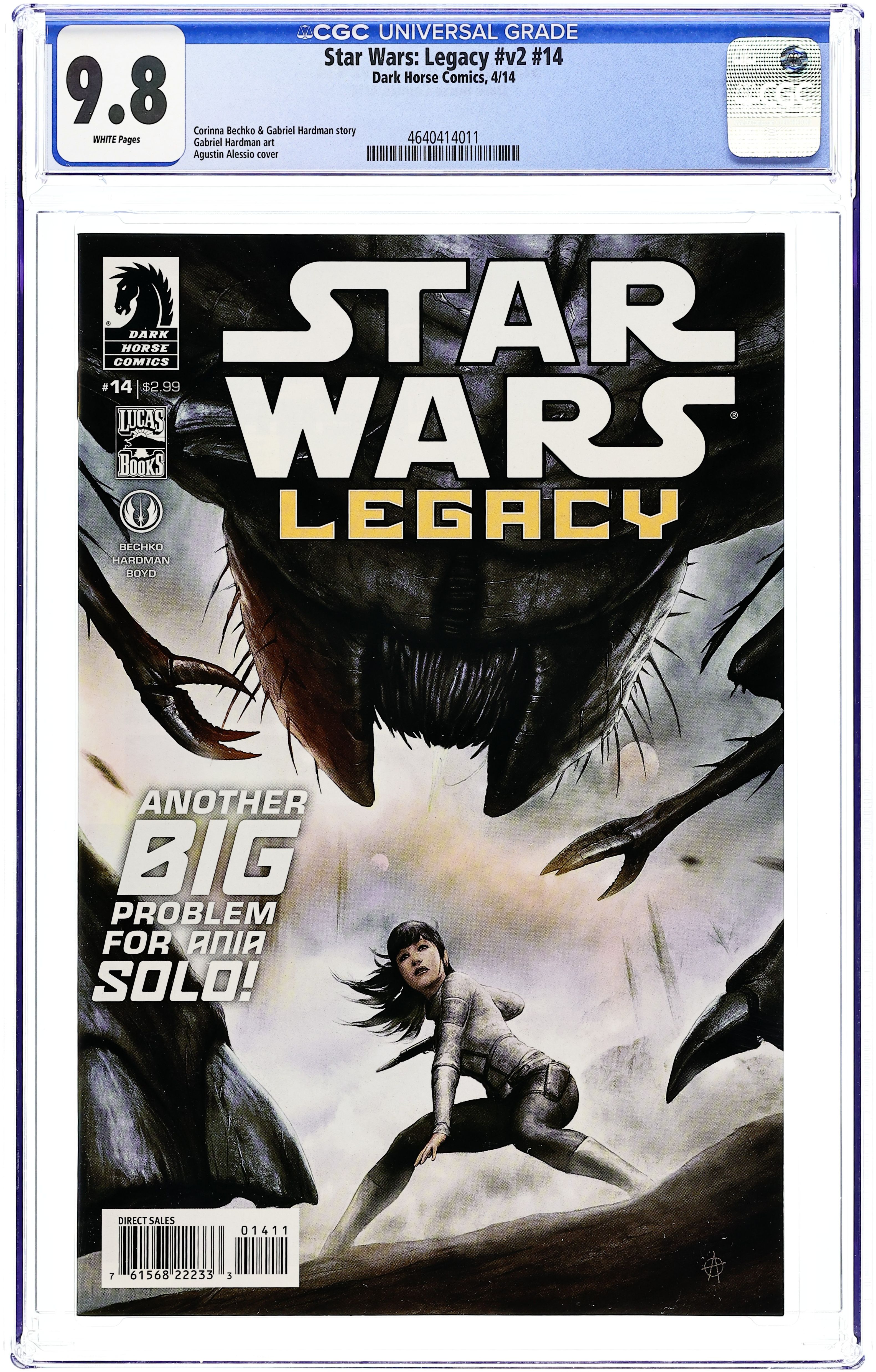 Written by Corinna Bechko and Gabriel Hardman. Art by Gabriel Hardman. Cover by Agustin Alessio. A look into Ania Solo's prison-camp past reveals a secret connection to the brutal bounty hunter who is desperate to bring her to justice-dead, not alive! But bounty hunters are only part of Ania's problems! 28 pages, full color. Cover price $2.99.