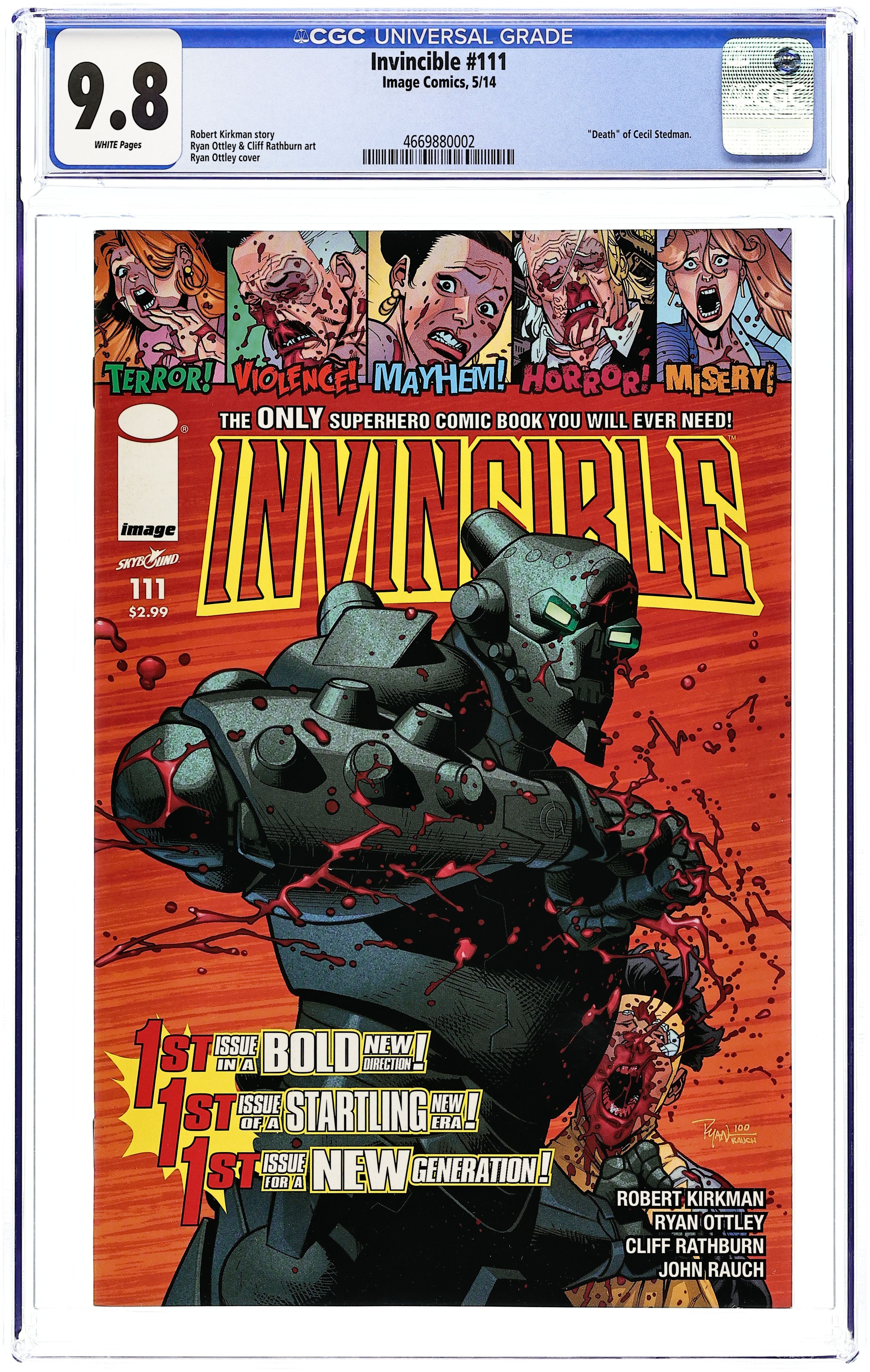 Written by Robert Kirkman. Art and Cover by Ryan Ottley. A new beginning for INVINCIBLE as things take a turn down a dark path. Everything changes as Invincible is betrayed by one of his own. You won't want to miss this explosive issue #1... 1... 1! It packs the punch of THREE relaunched number one issues! IN ONE BOOK! 28 pages, full color. Cover price $2.99.