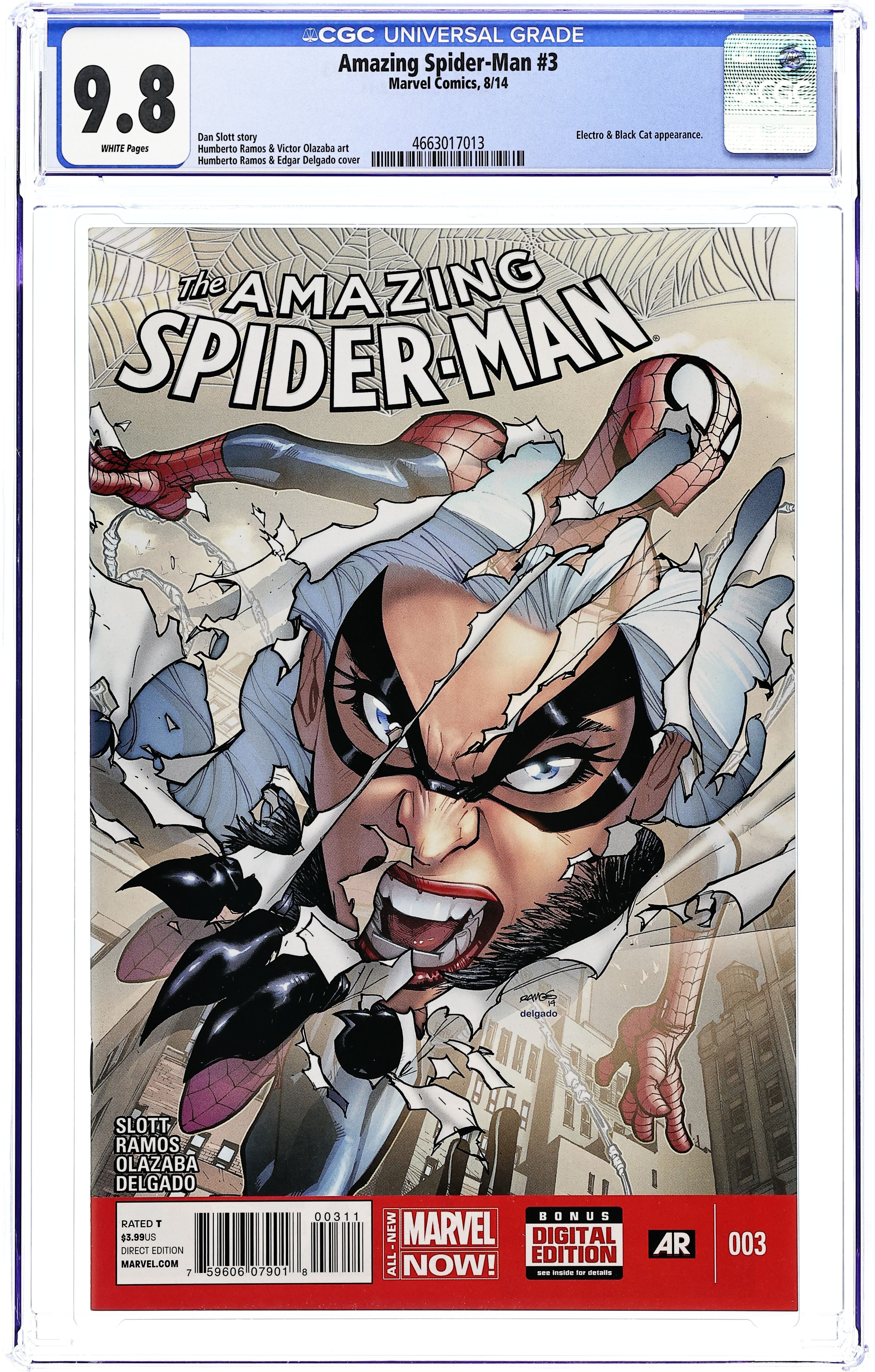 Written by Dan Slott. Art and Cover by Humberto Ramos. • Because of her last encounter with Spider-Man, Felicia Hardy lost everything. Now the Black Cat is back, and she doesn't want any apologies or excuses... just REVENGE. Plus: Spidey teams up with a real hero, fireman Pedro Olivera... who just happens to be the current boyfriend to one Mary Jane Watson. And... more on you-know-who from the opening scene back in ASM #1. You know who we're talking about. Yeah, that's right. You better not miss this one! 28 pages, full color. Cover price $3.99.