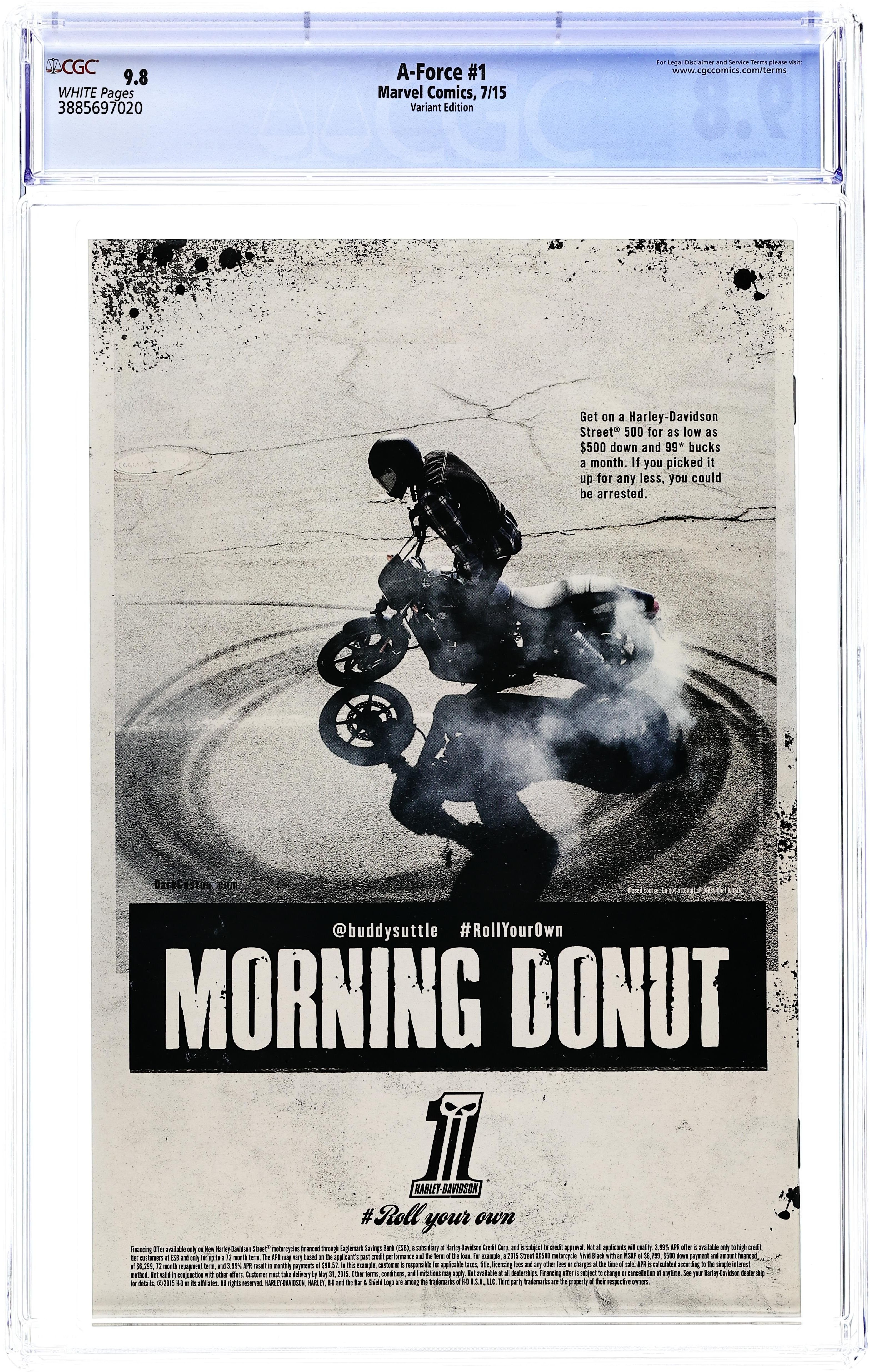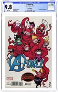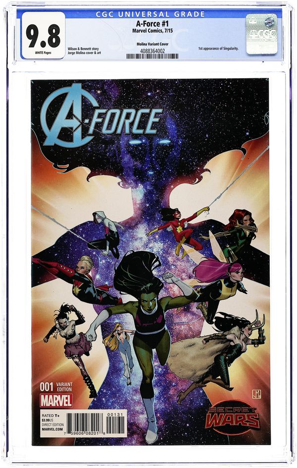 Limited 1 for 25 Retailer Incentive Variant Cover. Written by C. Willow Wilson and Marguerite Bennett. Art and Cover by Jorge Molina. Marvel's Mightiest Women finally get their own explosive series! In a secluded corner of the Battleworld, an island nation is fiercely protected by a team of Avengers the likes of which has only ever been glimpsed before… Fighting to protect the small sliver of their world that's left, the Amazing A-FORCE stands shoulder-to-shoulder, ready to take on the horde! 28 pages, full color. Rated T+ Cover price $3.99.