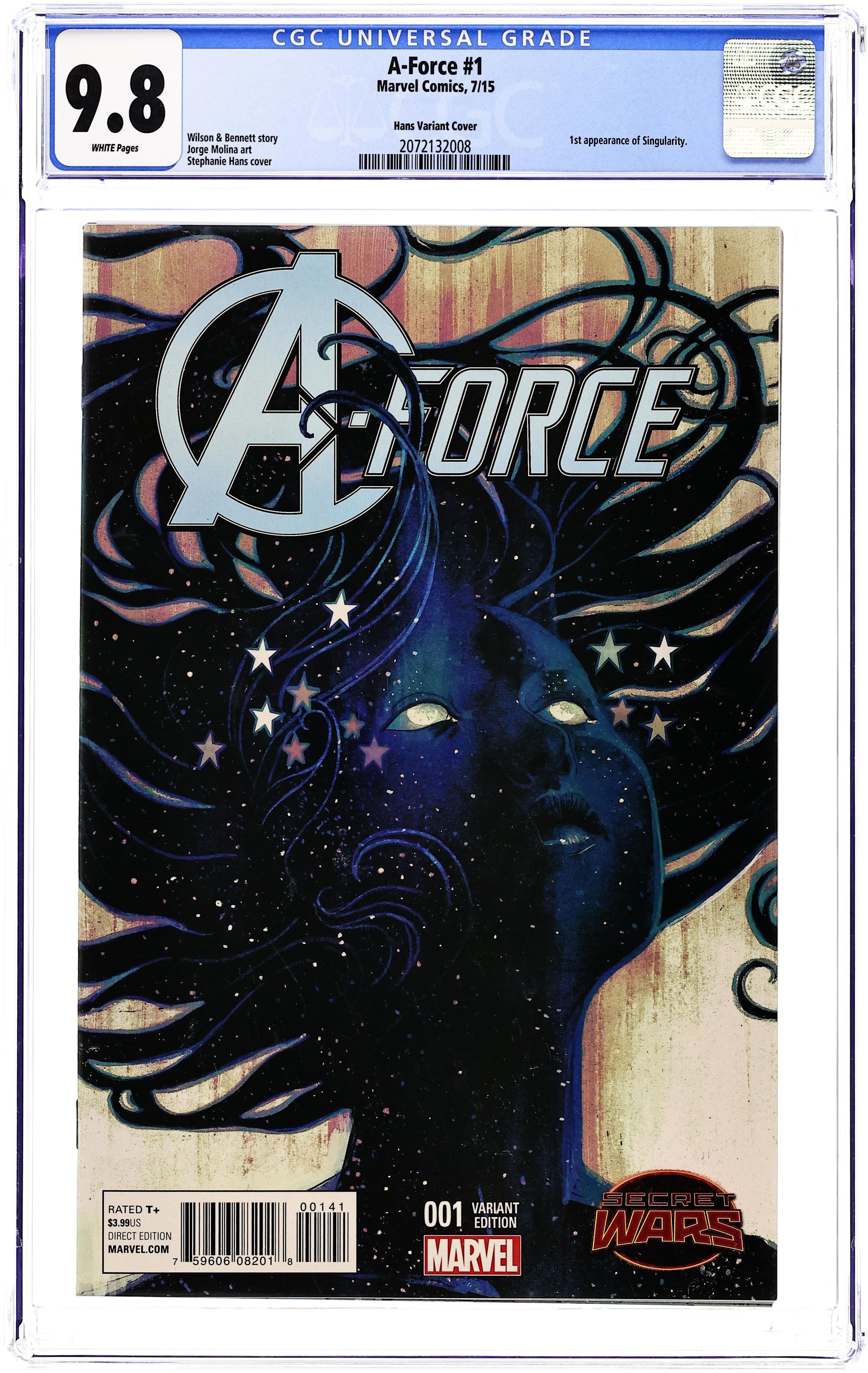 Limited 1 for 25 Retailer Incentive Variant Cover. Written by C. Willow Wilson and Marguerite Bennett. Art by Jorge Molina. Cover by Stephanie Hans. Marvel's Mightiest Women finally get their own explosive series! In a secluded corner of the Battleworld, an island nation is fiercely protected by a team of Avengers the likes of which has only ever been glimpsed before… Fighting to protect the small sliver of their world that's left, the Amazing A-FORCE stands shoulder-to-shoulder, ready to take on the horde! 28 pages, full color. Rated T+ Cover price $3.99.