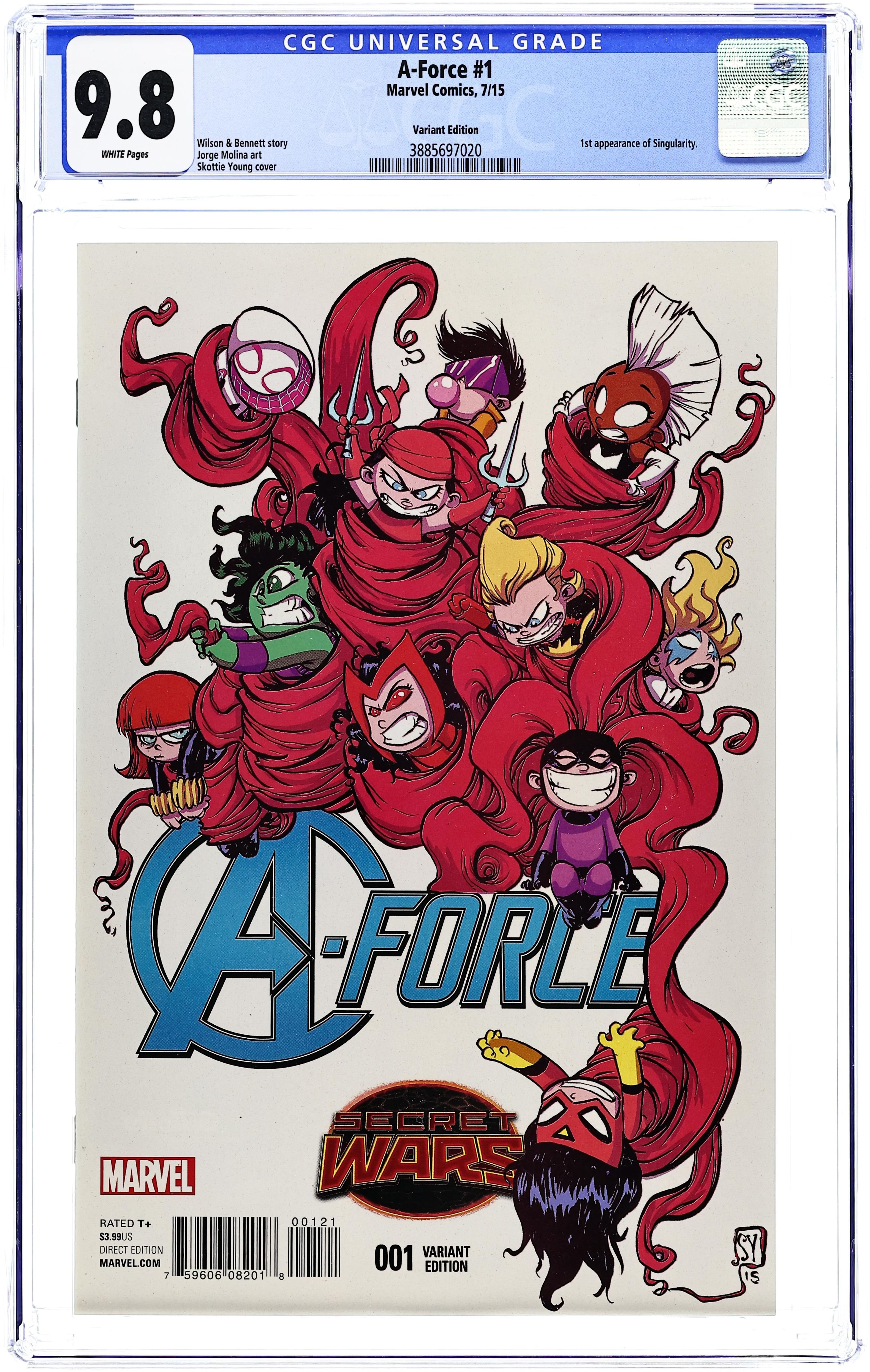 Written by C. Willow Wilson and Marguerite Bennett. Art by Jorge Molina. Cover by Skottie Young. Marvel's Mightiest Women finally get their own explosive series! In a secluded corner of the Battleworld, an island nation is fiercely protected by a team of Avengers the likes of which has only ever been glimpsed before… Fighting to protect the small sliver of their world that's left, the Amazing A-FORCE stands shoulder-to-shoulder, ready to take on the horde! 28 pages, full color. Rated T+ Cover price $3.99.
