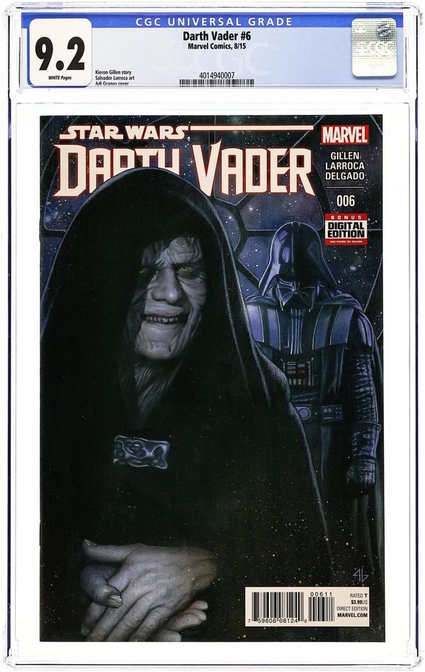 Written by Kieron Gillen. Art by Salvador Larroca. Cover by Adi Granov. The Emperor's machinations revealed! Everything changes for Vader! The tale of Vader's transformation from A New Hope to The Empire Strikes Back continues! 28 pages, full color. Rated T Star Wars Lucasfilm Ltd. & TM. All rights reserved. Used under authorization. Text and illustrations for Star Wars are 2015 Lucasfilm Ltd. Cover price $3.99.