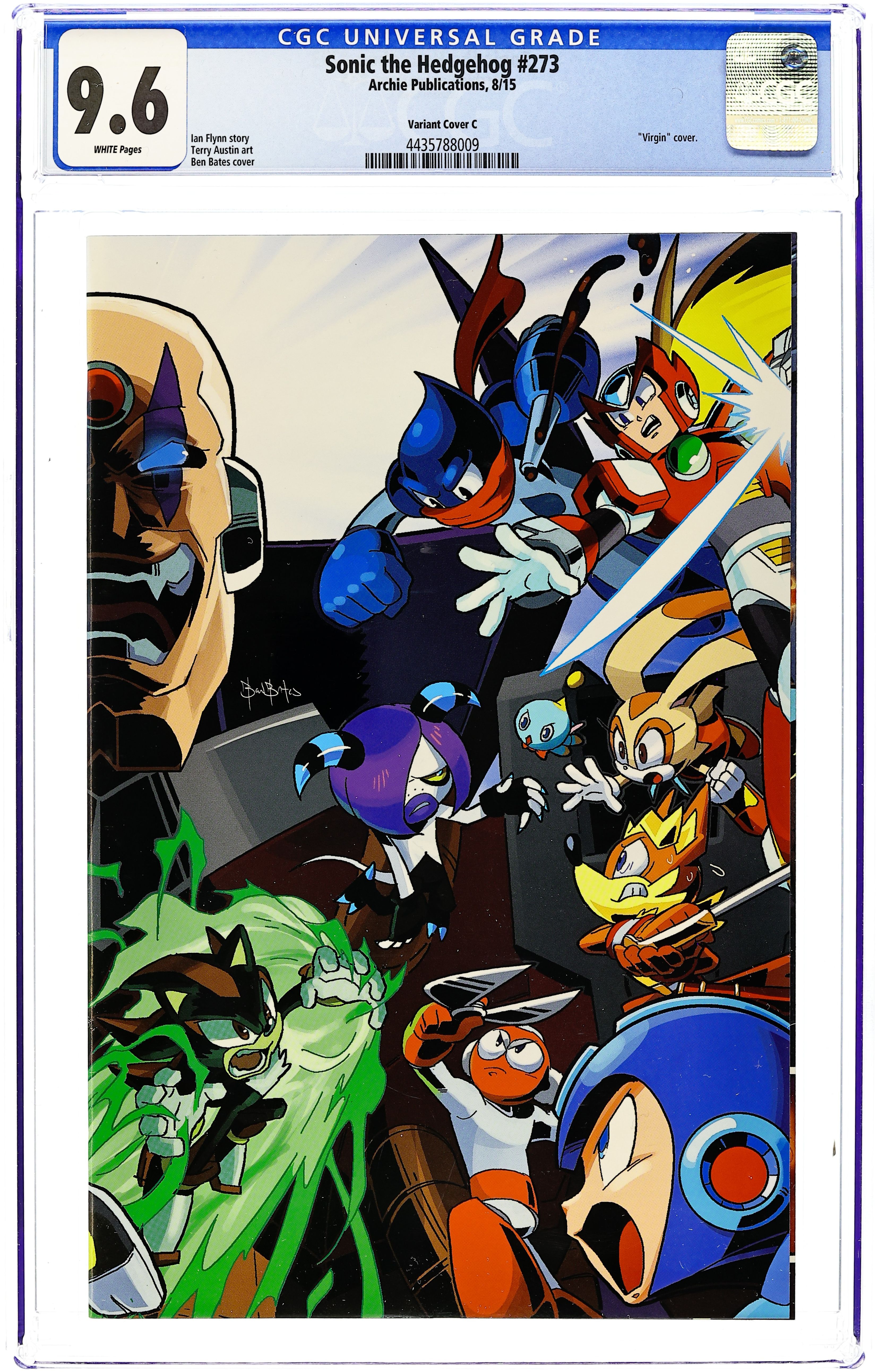 Written by Ian Flynn. Art by Terry Austin, Dan Schoening and Tracy Yardley. Cover by Ben Bates. The ALL-NEW Sonic/Mega Man Crossover sequel explodes onto the shelves with 'Worlds Unite' Part Three: It's a cascade of cross-dimensional chaos! On Sonic's World, the Freedom Fighters are battling with the terrifying arsenal of M'egga Man! On Mega Man's World, the Robot Masters can't keep up with the super speedy Sonic Man! Who can possibly save our heroes? The answer is sure to surprise you! After the history-making 'WORLDS COLLIDE' crossover event, Sonic the Hedgehog and Mega Man unite once more-and this time Sonic Boom and Mega Man X are joining the fray! 32 pages, full color. Cover price $3.99.