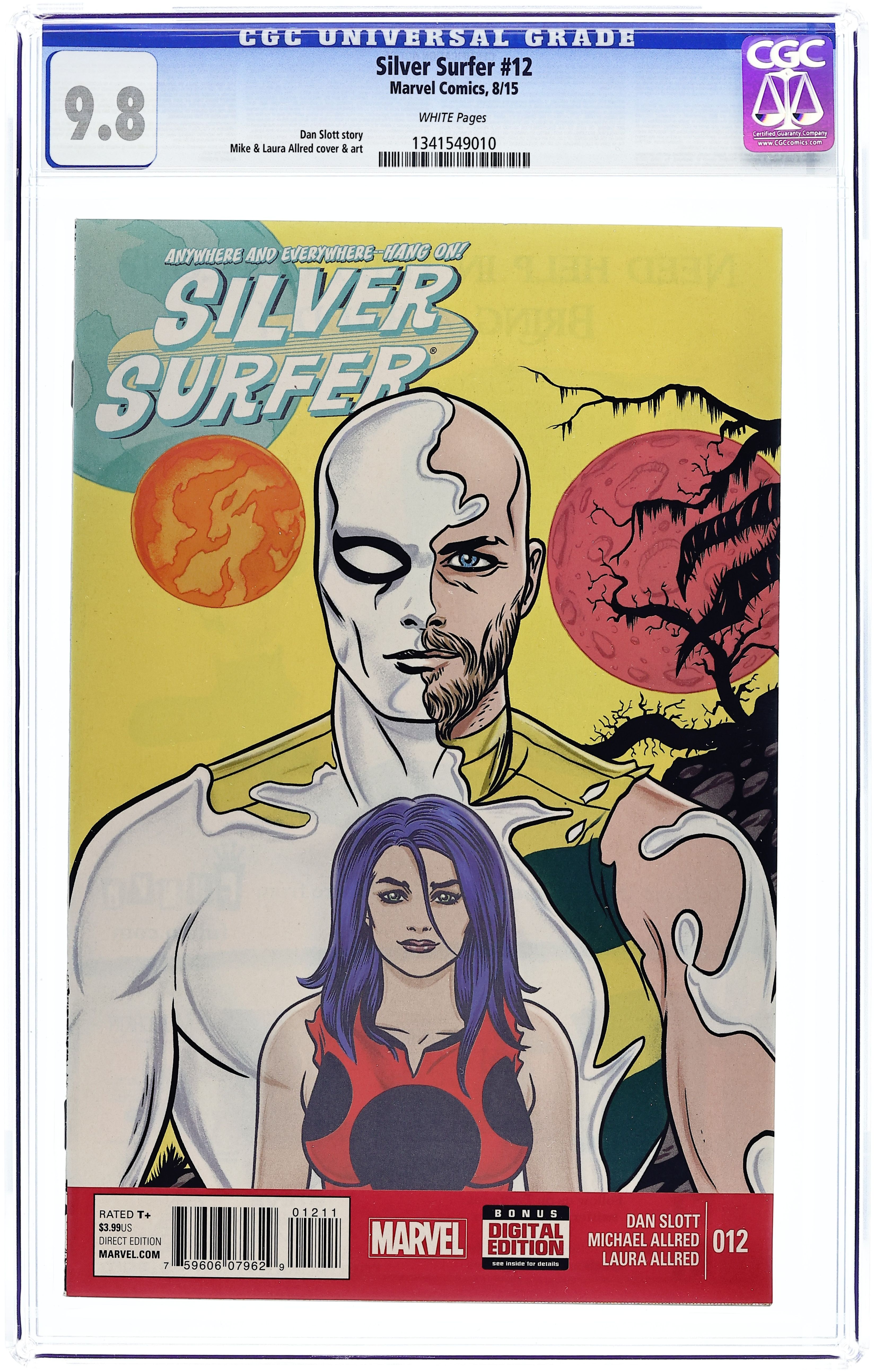 Written by Dan Slott. Art and Cover by Michael Allred and Laura Allred. 'THE NEW LIFE OF NORRIN RADD' No surfboard. No trace of the Power Cosmic. No hint of silver. It's an all-new life for Norrin Radd on an all-new world. And heralding a strange, new chapter in Dawn Greenwood's story as well... 28 pages, full color. Rated T+ Cover price $3.99.