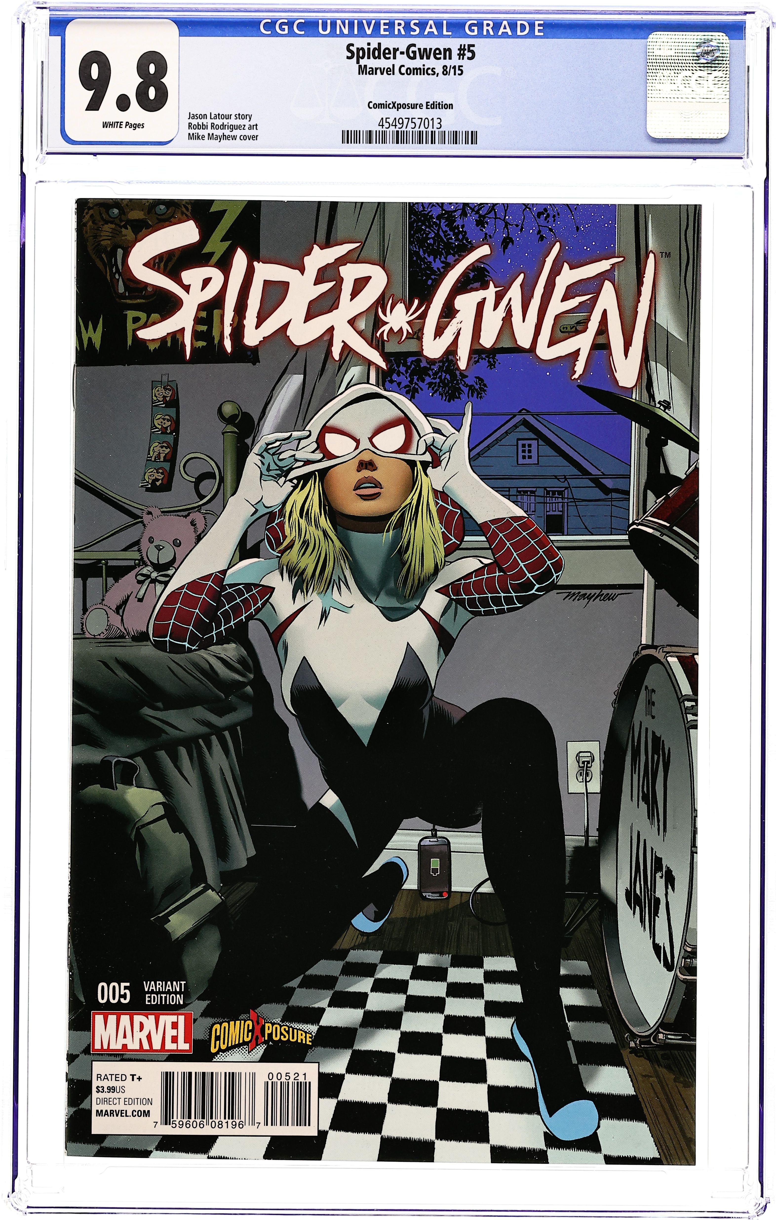 ComicXposure exclusive variant cover by Mike Mayhew. Written by Jason Latour. Art by Robbi Rodriguez. Still haunted by the death of her world's young Peter Parker, Gwen Stacy pays a visit to the two people who knew him best. 28 pages, full color. Rated T+