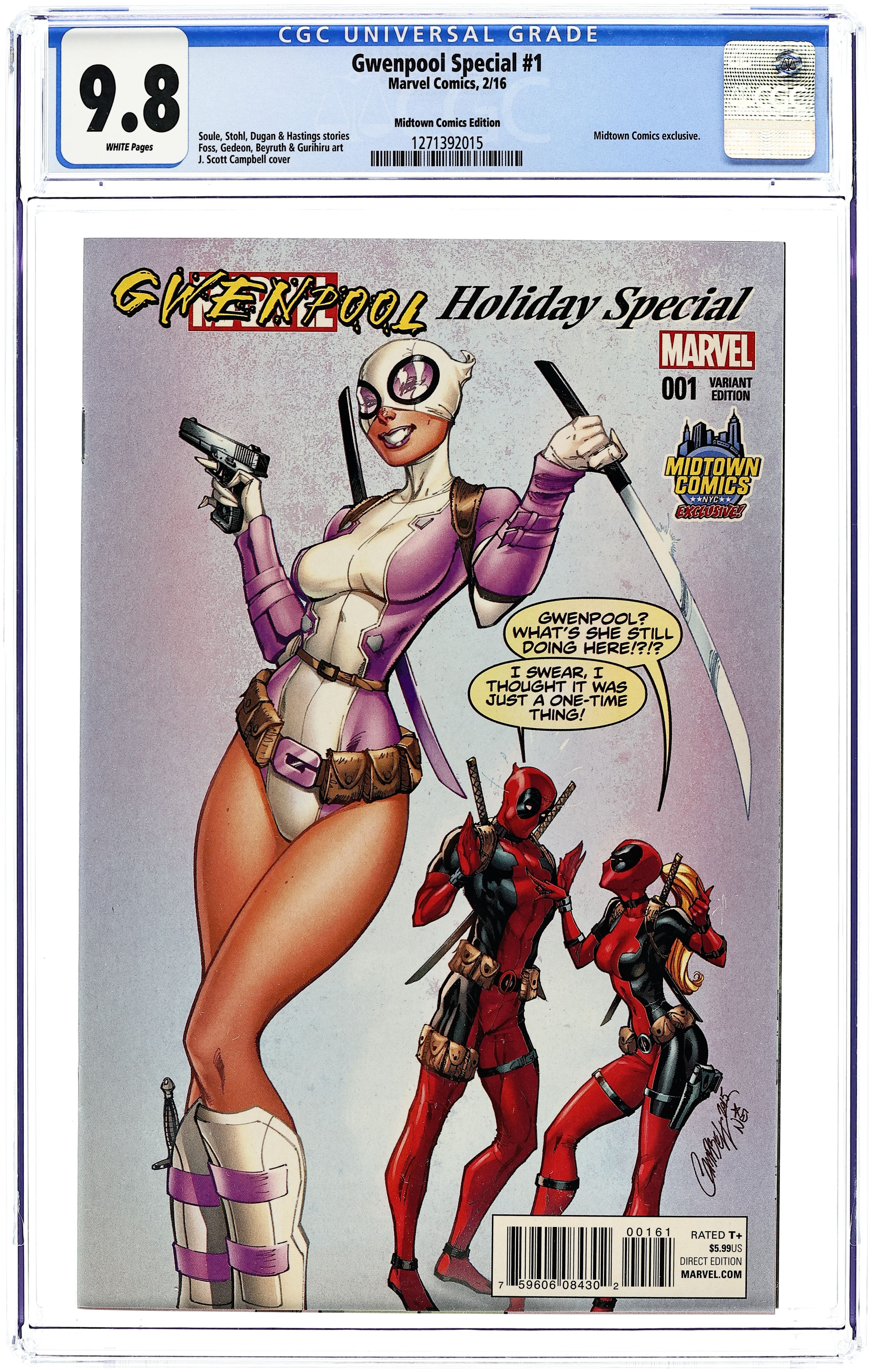 Ends Dec 8 8:31 PM CST Bid History 6 bids Current Bid $21 Your Secret Max Bid If you'd like to bid, please log in or register. Midtown Comics Variant. Written by Charles Soule, Margaret Stohl, Gerry Dugan and Christopher Hastings. Art by Langdon Foss, Juan Gedeon, Danilo S. Beyruth and Gurihiru. Cover by J. Scott Campbell. AN ALL-NEW, ALL-DIFFERENT MARVEL HOLIDAY SPECIAL! She-Hulk throws a holiday party and invites the entire Marvel U! Deadpool teams up with both Hawkeyes - Kate and Clint - to…stop a pickpocket?! Ms. Marvel takes on her most dangerous threat yet: the holiday blues! And then there's the reason for the season(al special): GWENPOOL! Yup, you read that right - Gwen. Pool. C'mon, you know you're curious. 60 pages, full color. Rated T+