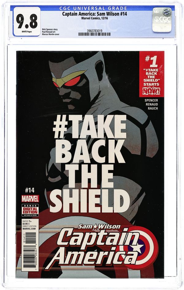 #TakeBacktheShield: Part 1 - Written by Nick Spencer. Art by Paul Renaud. Cover by Marcos Martin. 'TAKE BACK THE SHIELD' STARTS NOW! The world has received an ULTIMATUM: Peace in our time...or face the fury of The Flag-Smasher! Amid cries of '#TakeBacktheShield', Sam Wilson stands against a rising tide. But he is not alone! Guest-starring in this issue - Steve Rogers: Captain America! Only, Steve has a secret… 28 pages, full color. Rated T+ Cover price $3.99.