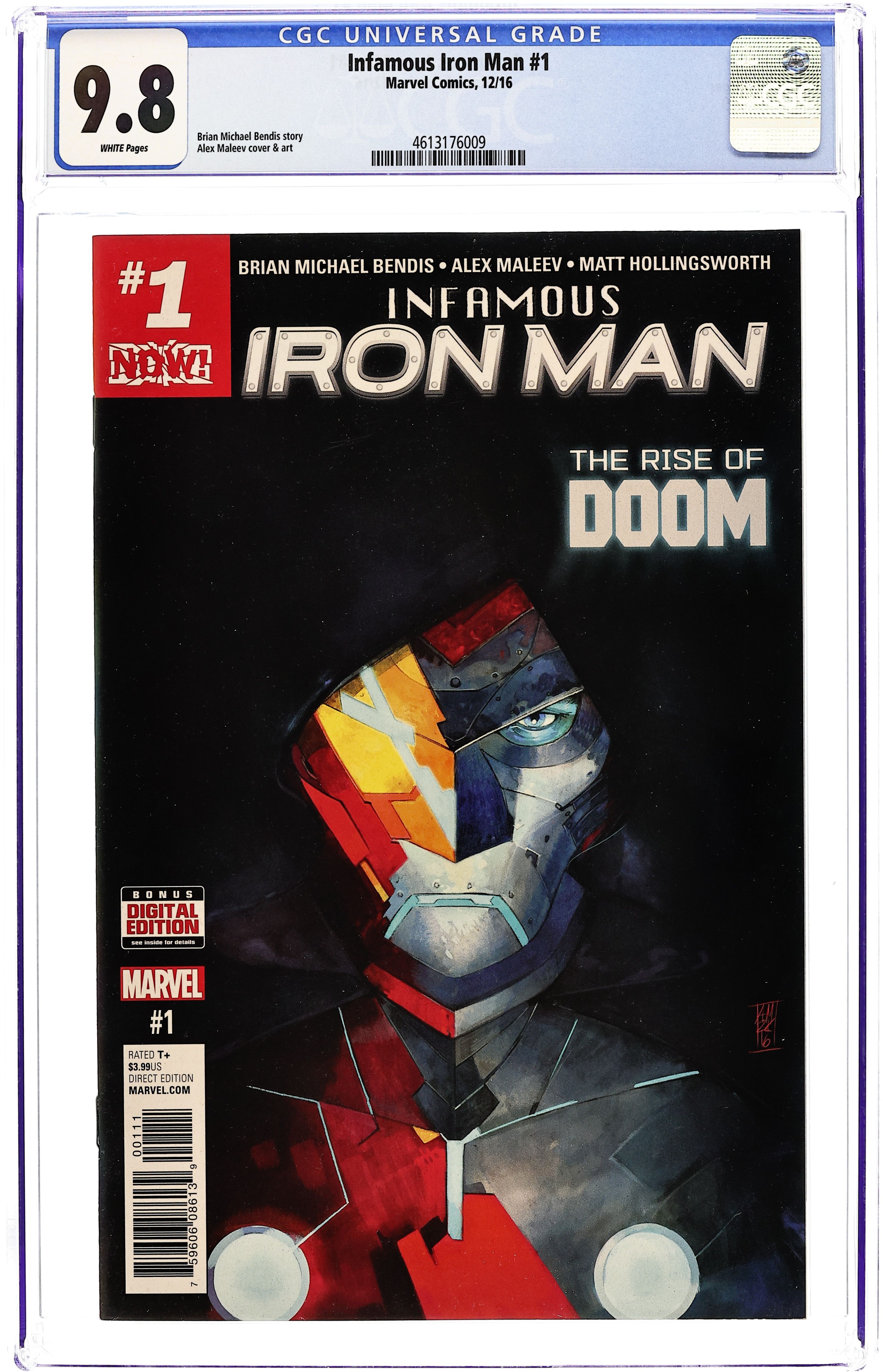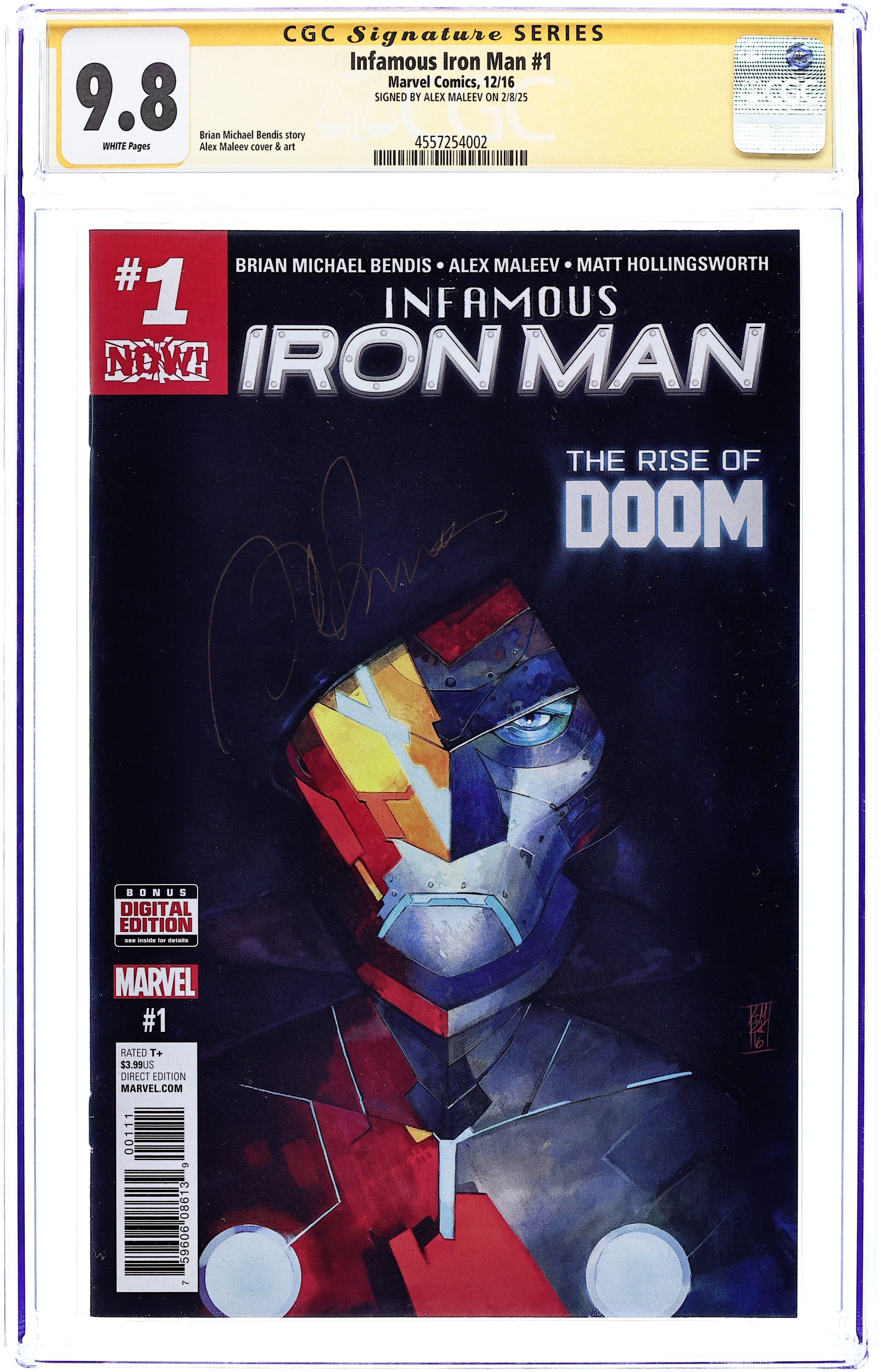 Limited 1 for 10 Retailer Incentive Variant Cover. Written by Brian Michael Bendis. Art by Alex Maleev. Cover by Mike Deodato. There is a new Iron Man in town and his name is VICTOR VON DOOM. The greatest villain of the Marvel Universe will try something new. Where Tony Stark failed, Doom will succeed. What is Doom's Master Plan? Rated T+ Cover price $3.99.