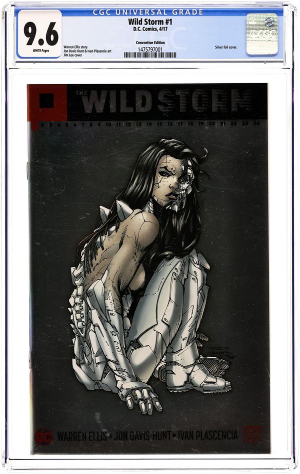 Convention exclusive variant cover. Written by Warren Ellis. Art and Cover by Jon Davis-Hunt. A troubled woman, barred by her employer from continuing her research, walks miserably through New York City. It takes her a moment to notice that everybody else is looking up. A man has been thrown from the upper floor of the Halo skyscraper. And that woman-Angela Spica, sick from the transhuman implants she's buried in her own body-is the only person who can save him. What she doesn't know is that the act of saving that one man will tip over a vast and secret house of cards that encloses the entire world, if not the inner solar system. This is how the Wild Storm begins, and it may destroy covert power structures, secret space programs and even all of human history. New York Times best-selling writer Warren Ellis (TRANSMETROPOLITAN, RED, PLANETARY) returns to DC to curate Jim Lee's WildStorm world, with this debut issue resetting the WildStorm universe with new iterations of Grifter, Voodoo, the Engineer, Jenny Sparks and others. 32 pages, full color. Rated T+ Cover price $3.99.
