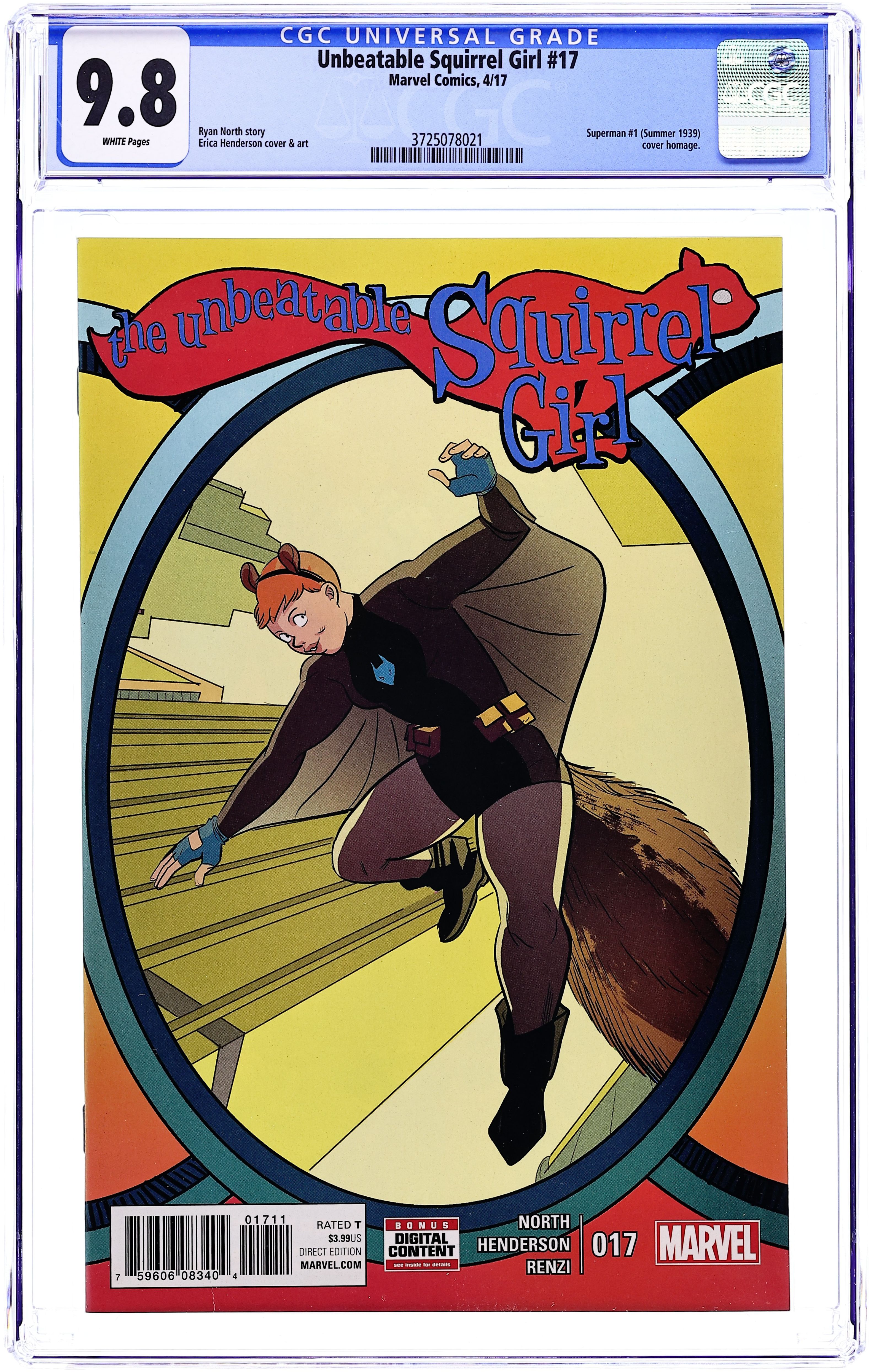 Written by Ryan North. Art and Cover by Erica Henderson. It's a normal quiet day at Empire State University, filled with lots of lectures and higher education, and OH BOY I can already hear y'all buckling up for a jam-packed thrill-ride of students learning quietly!! Well, BAD NEWS on that front, friends: Once all that quiet learning is out of the way, there's gonna be a FISTFIGHT! Plus, besides the cool fistfight, Doreen ALSO gets a new FLYING SQUIRREL suit, making her easily 2150% more unbeatable! With a new more powerful Squirrel Girl and a rad new suit, I'm certain crime is over forever. There's definitely not a new super villain in town conspiring to mold Squirrel Girl into the perfect minion... ...OR IS THERE? Who can say? Heck, I guess the only way to know for sure is to buy the comic and find out, right? 28 pages, full color. Rated T Cover price $3.99.