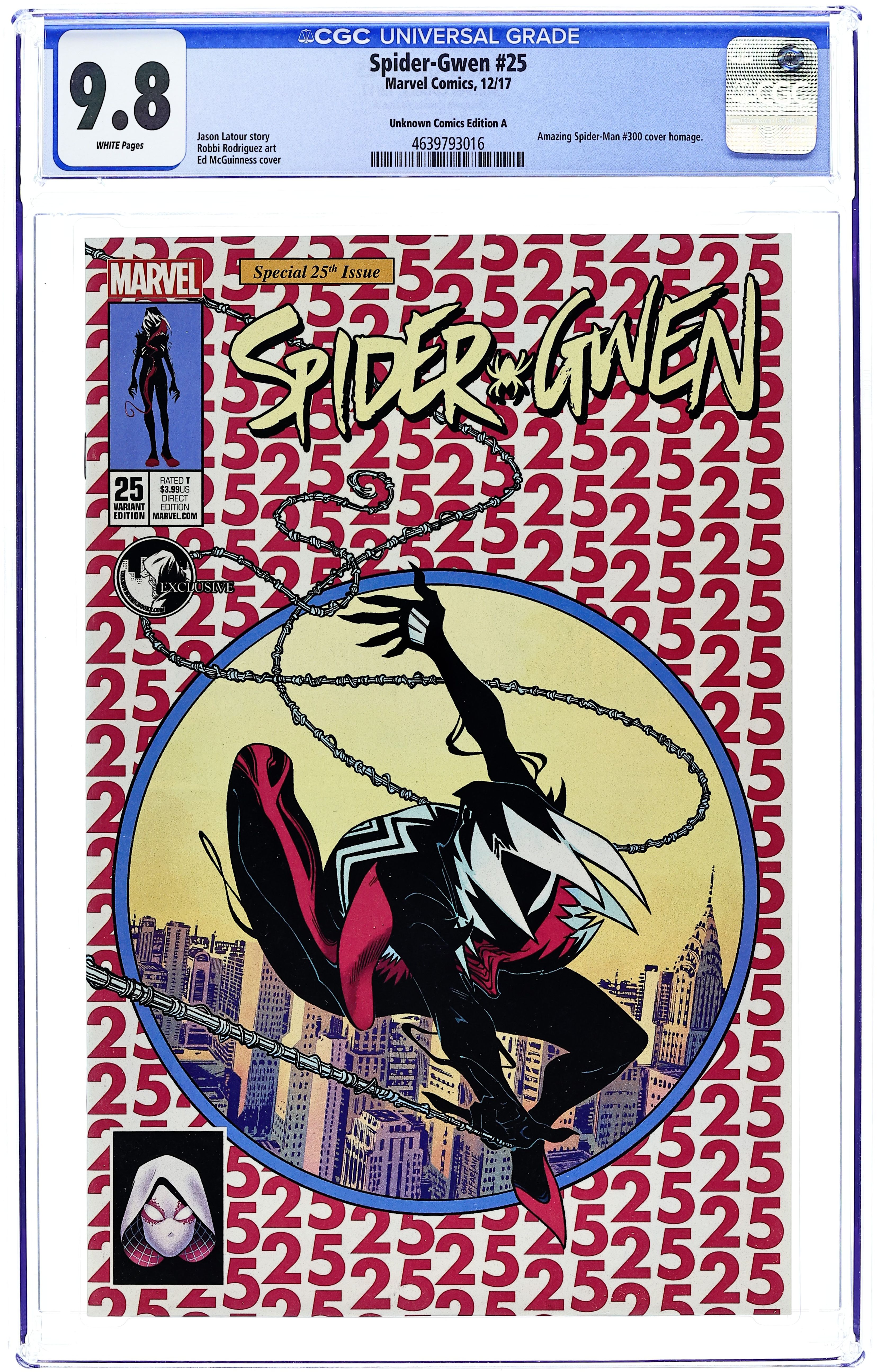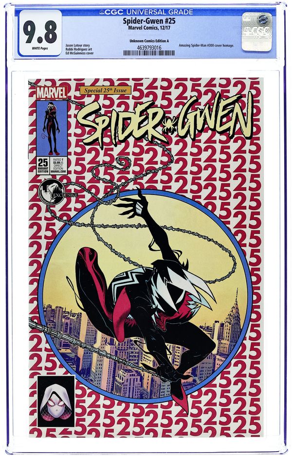 Unknown Comics A variant by Ed McGuinness. Written by Jason Latour. Art by Robbi Rodriguez. GWENOM Part 1 Gwen's life irrevocably changes as she bonds with her universe's version of the Venom symbiote. What does it mean for her relationship with crime kingpin MATT MURDOCK? With her father? With THE OSBORNS?! Is any relationship in Gwen's life safe? It's SPIDER-GWEN like you've never seen her before, and this time, there's no easy fix for her troubles! PLUS: Includes 3 bonus MARVEL PRIMER PAGES! Story by Robbie Thompson and art by Mark Bagley! 28 pages, full color. Rated T NOTE: Includes Marvel Value Stamp #30 of 53: Medusa. Cover price $3.99.