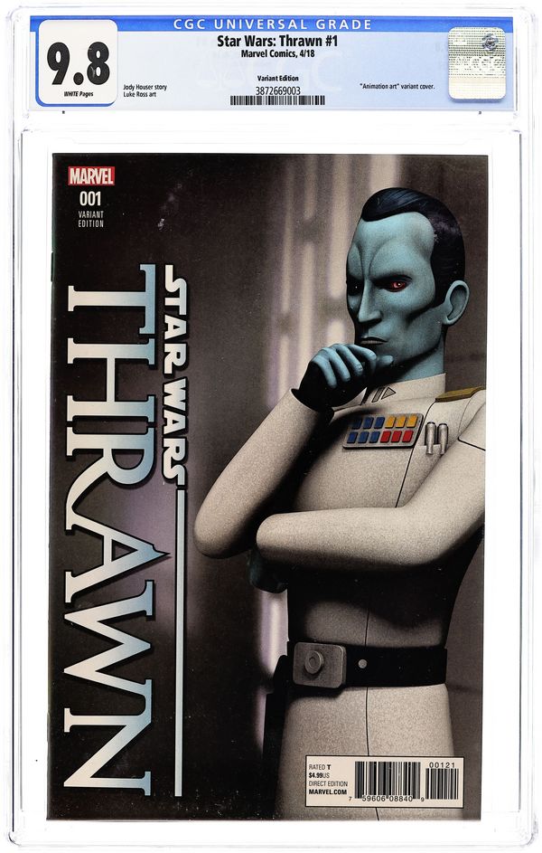 Limited 1 for 10 Retailer Incentive Animation Variant Cover. Written by Jody Houser. Art by Luke Ross. One of the most cunning and ruthless warriors in the history of the Star Wars Universe, Grand Admiral Thrawn is back with a six-issue miniseries about how he became one of the most feared military tacticians in a galaxy far, far away. Written by Jody Houser (ROGUE ONE ADAPTATION) and drawn by Luke Ross (STAR WARS: DARTH MAUL, STAR WARS: THE FORCE AWAKENS ADAPTATION), follow the comic adaptation of Timothy Zahn's New York Times best-selling novel about Thrawn's rise in the Imperial ranks! 36 pages, full color. Rated T Cover price $4.99.