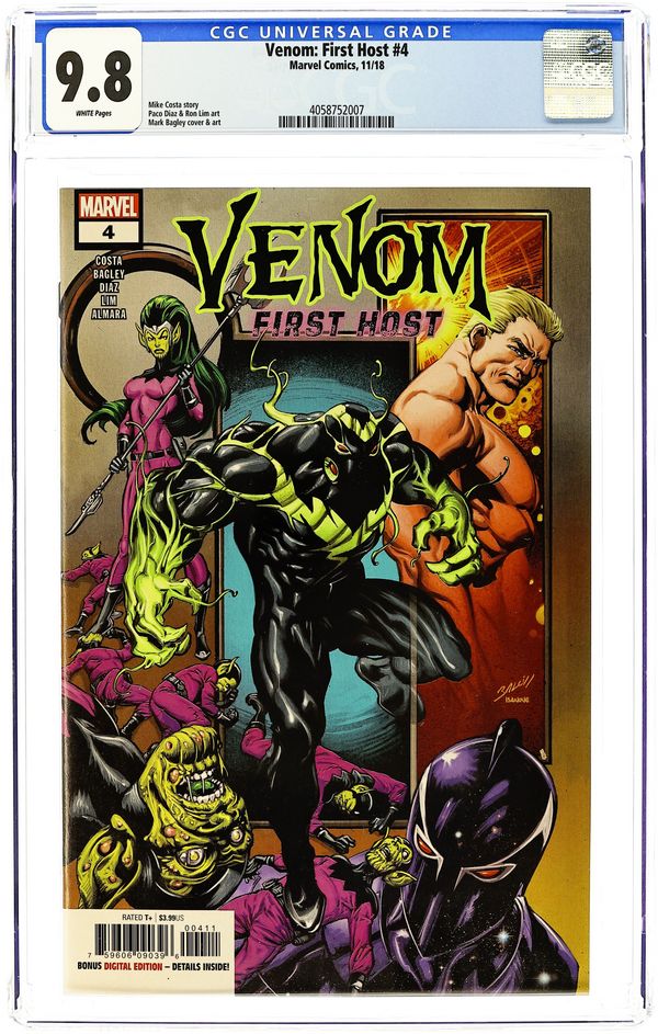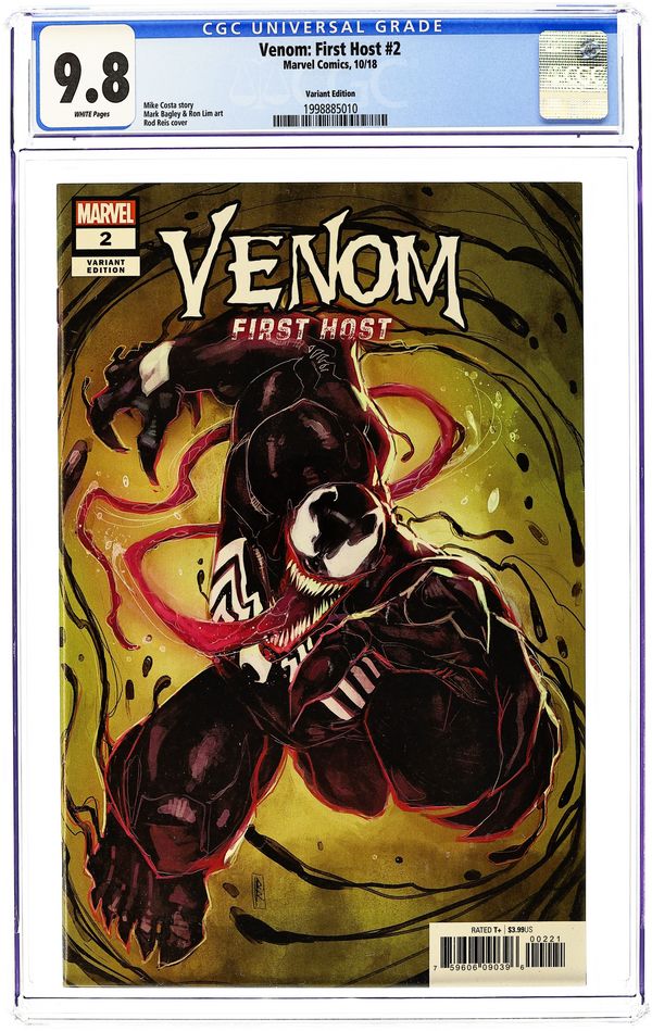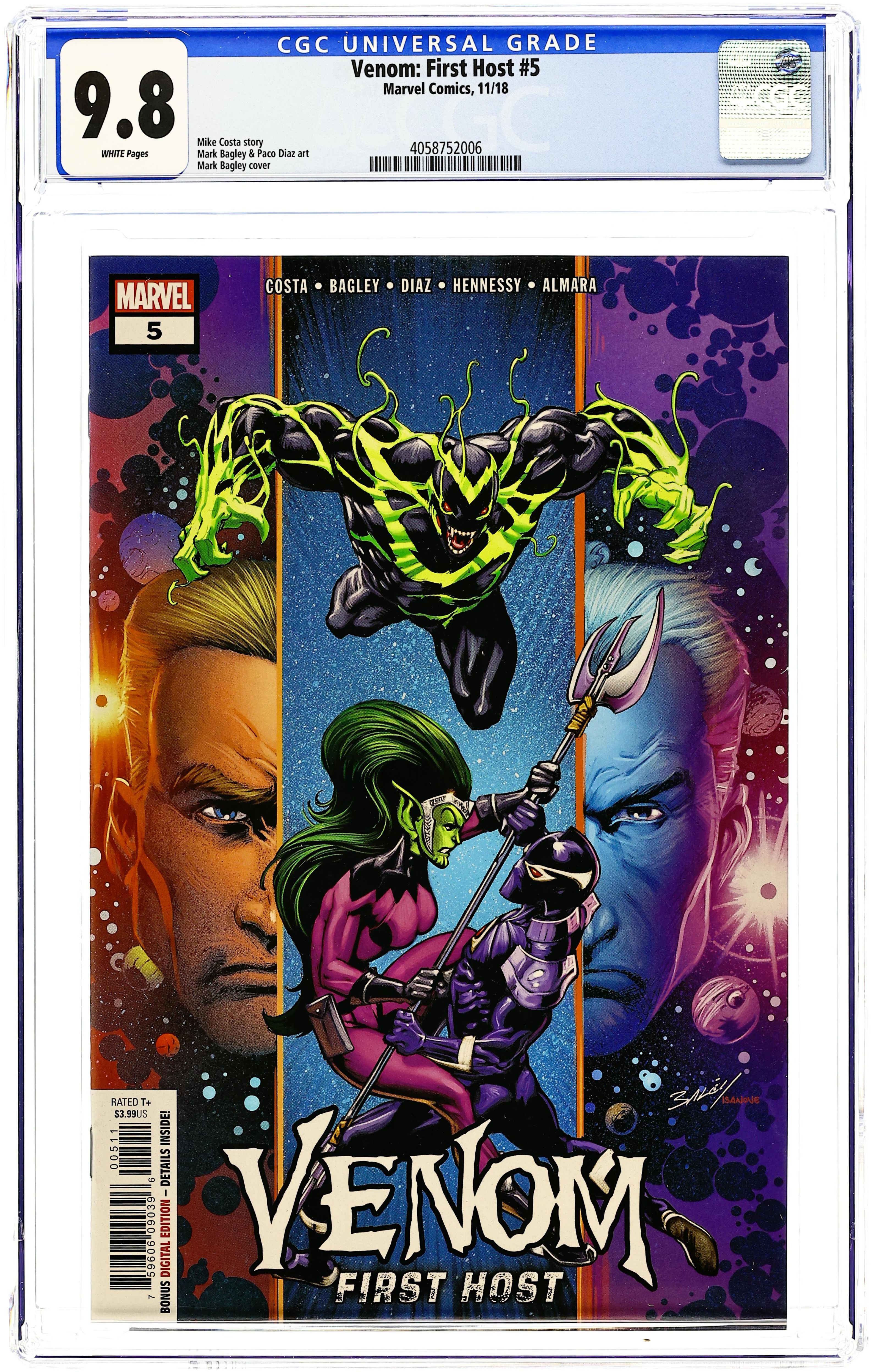 Written by Mike Costa. Art by Mark Bagley and Ron Lim. Cover by Mark Bagley. After the extraterrestrial ambush of last issue, the Venom symbiote will have to choose between allowing its newborn offspring to die…or separate from Eddie Brock! 28 pages, full color. Rated T+ Cover price $3.99.